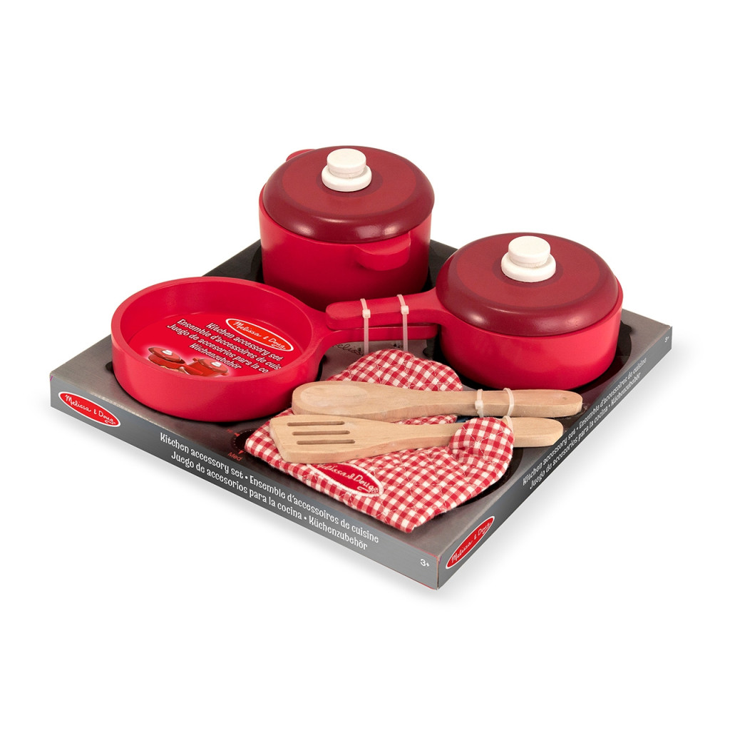 Ez a 8 részes fa edénykészlet minden, amire szükségetek lehet egy gyerekkonyha felszereléséhez. Tartalmaz egy serpenyőt, egy fazékot és egy fogantyús tálat, két fedőt, egy főzőedényt, egy spatulát és egy kesztyűt. A csomagolás tűzhely formájú és használható a játékban. Mérete: 27 x 27 x 13 cm.
