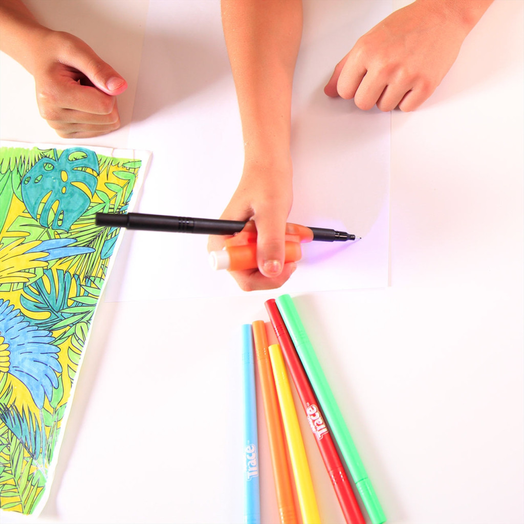 Ragyogó rajzolás, kreatív varázslat vár a Magic Trace kreatív szettekkel! A készletben található lapok látszólag üresek, ám ha a lámpát a lap a filcre helyezed, majd felkapcsolod, titkos vonalak sejlenek fel a papíron a fényben, mintha csak egy bűbájjal hívnád elő a rejtett motívumokat. A fényben látott íveket könnyen átrajzolhatod a filcekkel, azután pedig kedved szerint színezheted az ábrákat.