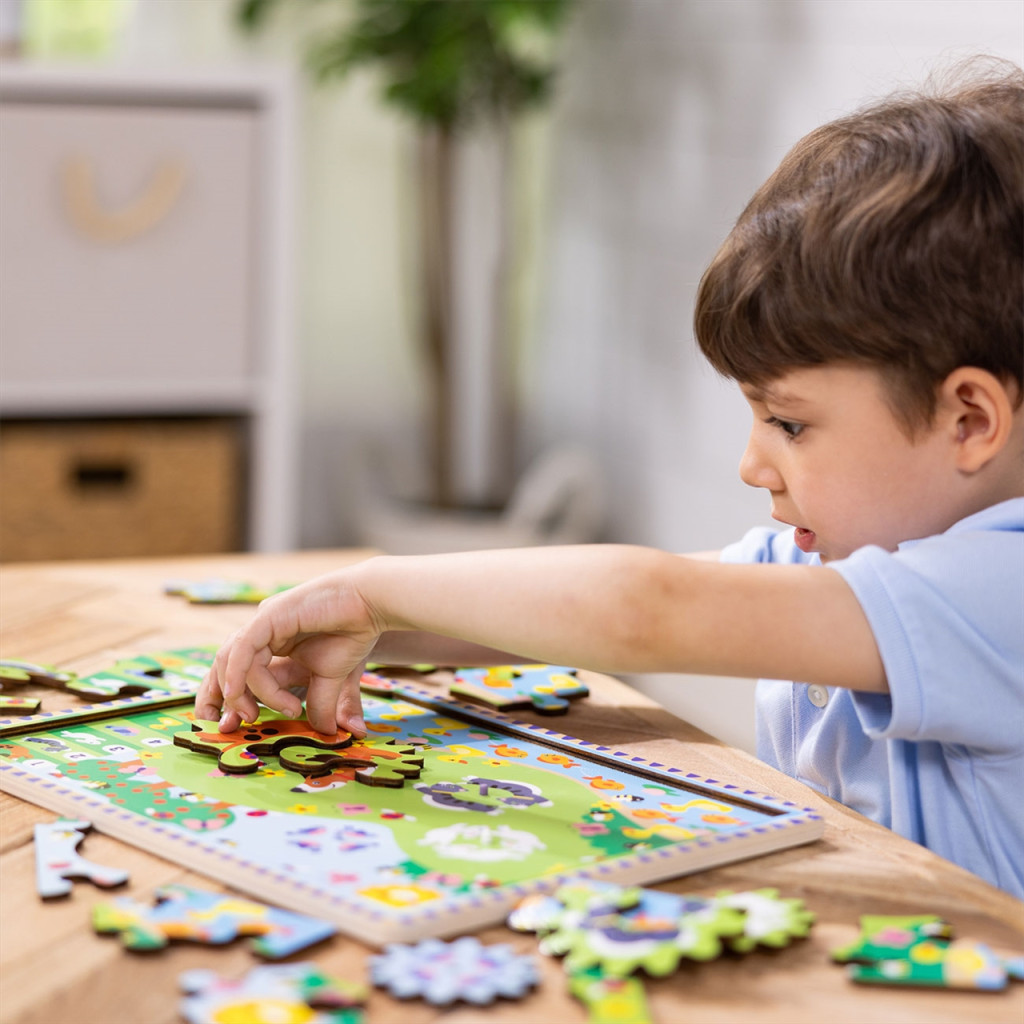 Ez a Melissa & Doug állatos kirakó fejlesztőjáték csupa móka és felfedezés a gyerekeknek. Egyszerre három készséget, tudást fejleszt. Először a puzzle darabjait illeszthetik össze, ami a finommotorikát és a vizuális képzelőerőt tornáztatja. A darabok között négy fogaskerék részei is helyet kaptak, amik az ok-okozati összefüggések megismerésével együtt forognak. Az összerakott puzzle még ezután is játékos tanulást ígér. Az állatok ugyanis csapatokban játszanak a képen. Vajon hányan vannak? A kép jobb oldalán lévő összegző segít a gyerekeknek az első számok tanulásában. 3 éves kortól ajánljuk.