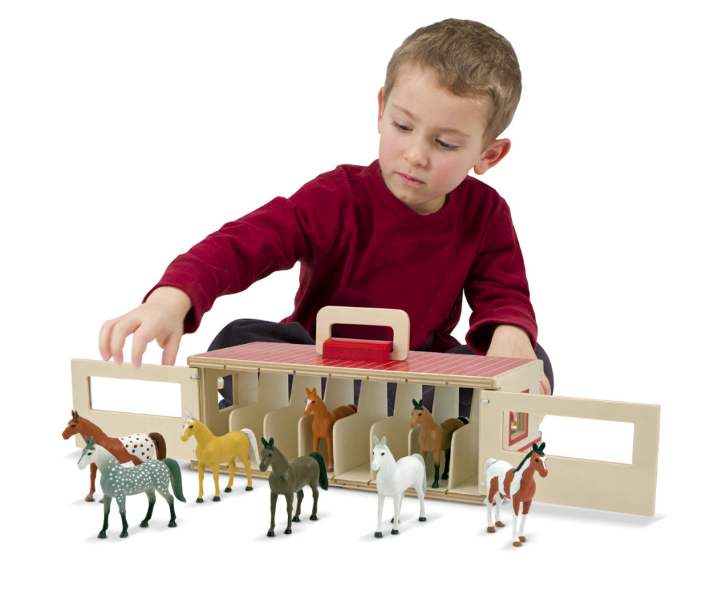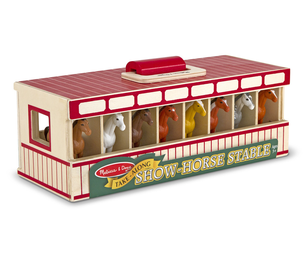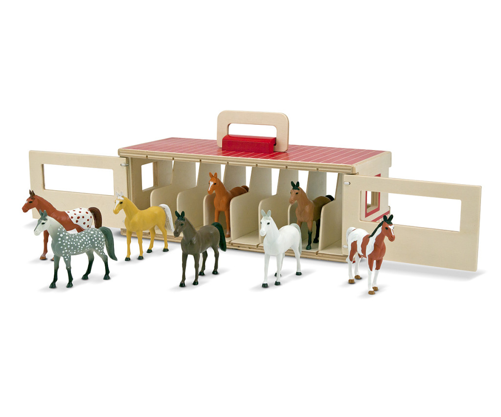 8 játék ló nyitható ajtajú istállóval minőségi fából, mely kortól függetlenül elkápráztat minden kis lovast. Gyönyörű Melissa & Doug fajáték. Nyisd ki az istálló ajtaját, engedd szabadon a lovakat, hogy együtt játszhassatok! Csodáld meg a lovak egyedi fajtajeleit, majd tedd vissza a helyükre, csúsztasd rá a reteszt az ajtóra játék végén, hogy a legközelebb is megtaláld őket. Nagyon szép, igényes játék szerepjátékhoz, lovas mesék kitalálásához. Az istálló praktikus tároló is egyben. Az istálló tetején egy erős fogantyú is található, gyermekre ártalmatlan fémből, így bárhova viheti magával.