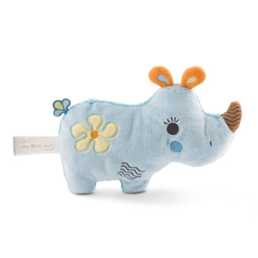 A halványkék My First NICI Wombitombi 2D plüss, Manuffi orrszarvú 20 cm széles. Tisztítása mosógépben is lehetséges, finommosással 30 fokon mosható.