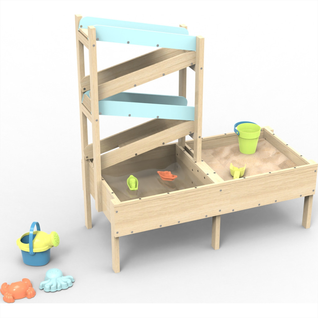 A Wonderland homokozó terepasztal igazi kreatív játszótérré varázsolja a kertet vagy a teraszt. A megemelt kialakításnak köszönhetően a gyerekek kényelmesen, állva vagy ülve játszhatnak, miközben homokkal és vízzel kísérleteznek. A terepasztal több szintből és lejtős csatornákból áll, így a víz és a homok izgalmas utat járhat be, ami folyamatosan új játékhelyzeteket teremt.