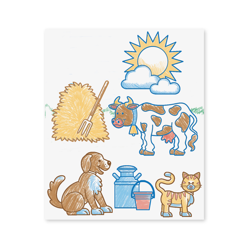 A készlet tartalma: 20 db gumírozott fanyelű nyomda, kétszínű tintapárna (kimosható barna és zöld festékekkel), továbbá 5 színes ceruza, amivel tovább színesítheti gyermeked a megálmodott történetet. Egy teljes készlet gyermeked számára egy izgalmas történet megformálásához.