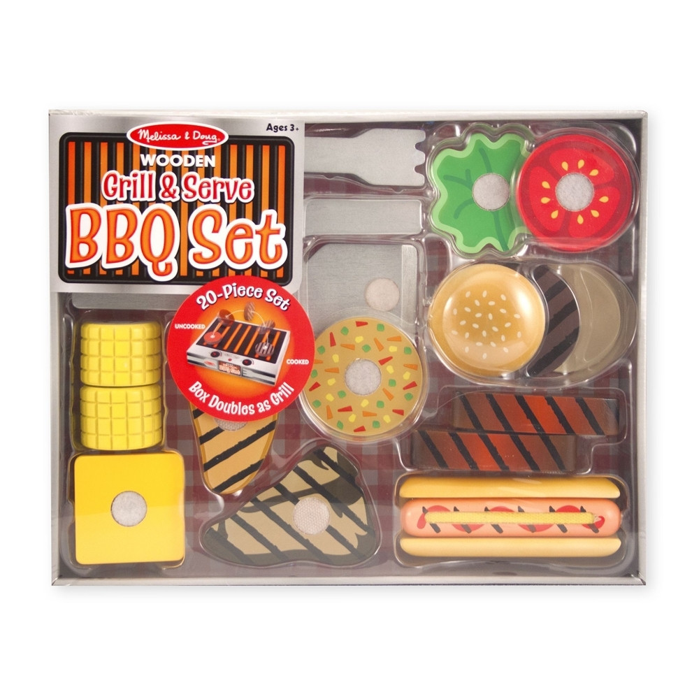 Izzítsátok a képzeletet, amíg begyújtjátok ezt a barbecue grillt és csaphattok egy nagy lakomát! A 20 darabos faételkészlet olyan grill kedvenceket tartalmaz, mint például a hot-dog, hamburger, csirke, steak, oldalas, vega burger és kukorica, valamint ízletes önteteket és eszközöket is találtok ebben a készletben. Fordítsd meg a kartondobozt, ami a csomagolás is egyben, és már meg is van a „grillrács", rajta megrajzolva a hőfokot állító gombok, valamint négy tépőzár korong, amik nem engedik csúszkálni az ételt. A kétoldalas ételdarabok egyik oldala nyersen ábrázolja az ételt – de fordítsd meg a darabokat a csipesszel vagy a húslapáttal, és a másik oldalán már az elkészült ételt láthatod! A zsemlét használva készíthetsz szendvicset friss öntettel. Az öntapadó, tépőzáras fülek bizonyos elemeket összetartanak. Hallgasd meg a szeletelés szuper jó hangját, amikor a játékkéssel felvágod az ételeket. Tálald a finomságokat kockásabroszra helyezve. Étkezés után használd a grill / kartondobozt praktikus tároló helyként az összes elem raktározására! A Fa Grill & BBQ tálaló szett elősegíti a kéz-szem koordináció, a kreatív kifejezés és a képzelőerő fejlesztését.