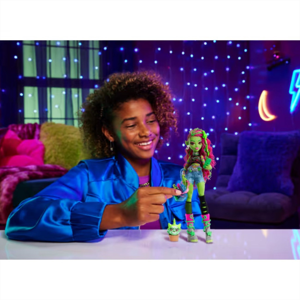 A Monster High bemutatja Venust, a természetközeli növényszörnyet, aki szenvedélyesen védi a környezetet, miközben rémesen divatos marad. A Monster High világának új szereplője stílusos megjelenéssel, részletgazdag kiegészítőkkel és hűséges kiskedvencével érkezik, hogy inspirálja a fantáziadús történetmesélést.