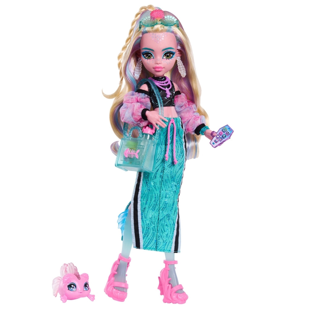 A Monster High kedvelt tengeri szörnylánya, Lagoona Blue, rövid felsőt és sportos maxi szoknyát visel. A túlméretezett ujjak, halszálka formájú fülbevalók, valamint a tengeri hangulatú cipő zoknival igazán egyedivé teszik a megjelenését. Mellette ott úszkál kiskedvence, Neptuna, a pirája, aki saját kis nassolnivalóval is érkezik.