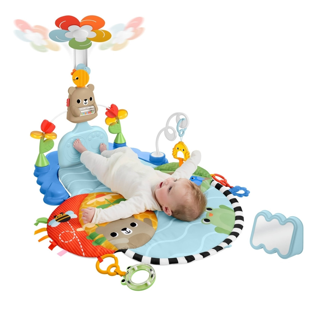 Hanyatt fekve a babák lábukkal a tappancsos jelzéseket rugdosva mozgásba hozhatják a vidám, forgó virágot. Ahogy nőnek és hasonfekvés közben játszanak, felfedezhetik magukat a tükörben, valamint elérhetik és megfoghatják a csörgőt és a rágókát. Később, ülő helyzetben, a pörgő-forgó elemek nyújtanak hosszabb ideig tartó elfoglaltságot.