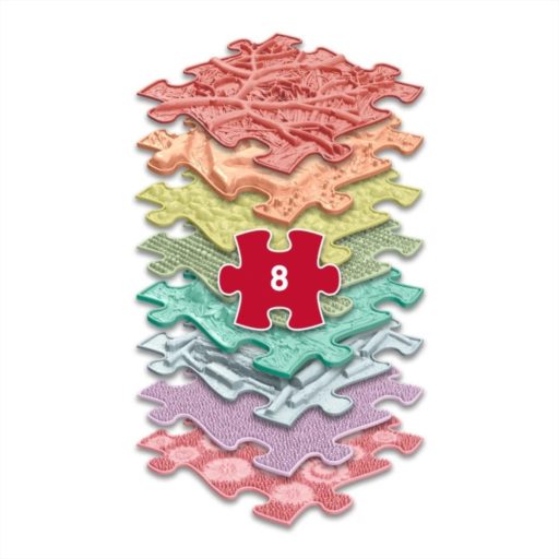 A szett tartalma (8 db): 1× Gyökerek, kemény, korall, 1× Traktornyom, kemény, pasztell narancs, 1× Kavicsok, kemény, pasztell sárga, 1× MUFFIK, puha, pasztell zöld, 1× Gesztenyék, puha, pasztell türkiz, 1× Rönkök, kemény, pasztell kék, 1× Fű, puha, lila, 1× Rét, kemény, pasztell rózsaszín