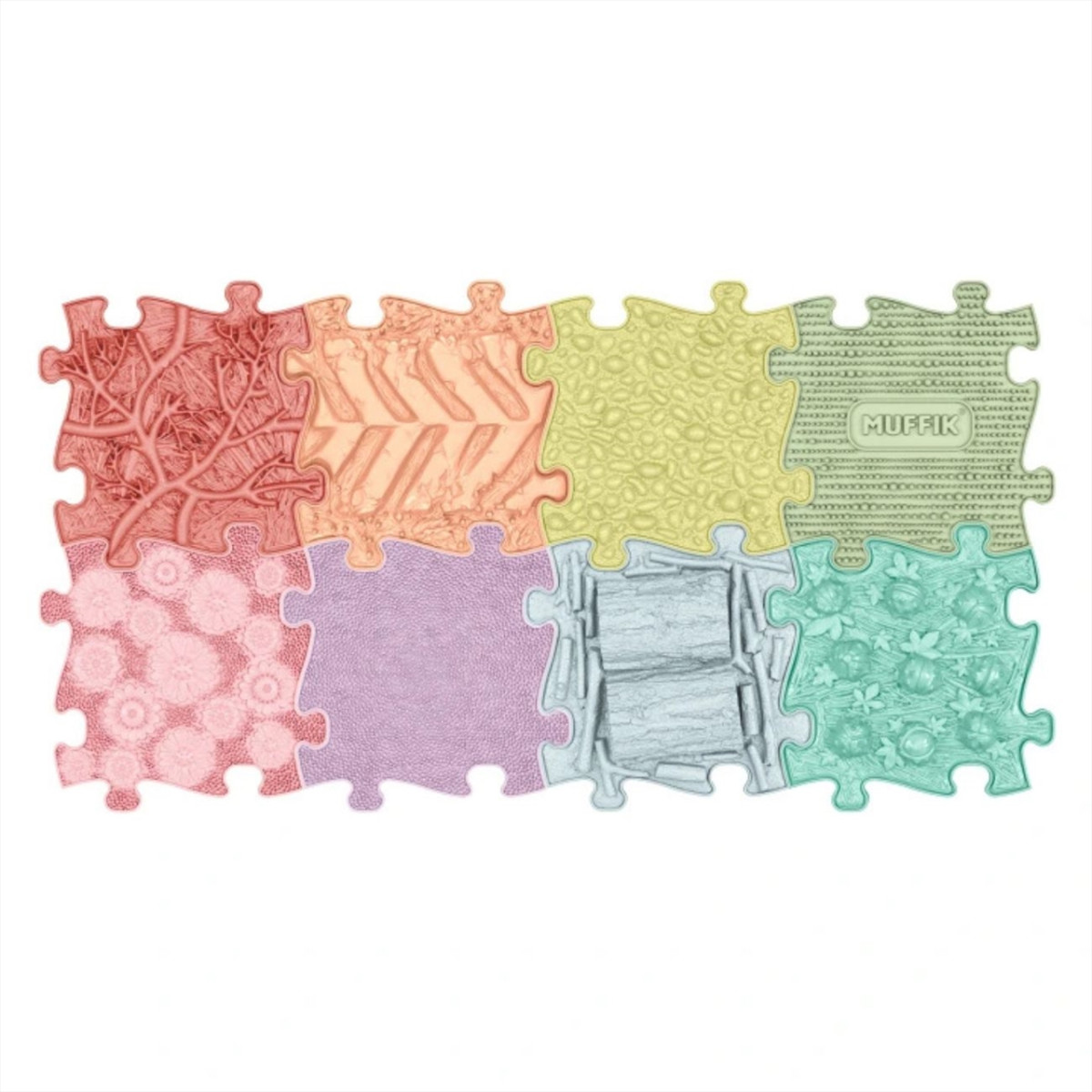 A Muffik szenzoros ortopédiai szőnyeg kirakódarabjai gyártásánál az elkészítőket a természet ihlette meg. Kövek, fatörzs, fű, kavicsok, kagylók várják, hogy rajtuk lépdelve felfrissüljetek. Közismert, hogy mezítláb járkálni különböző formájú valós elemeken jót tesz a talpnak, illetve a bokának. Biztos éreztétek már, hogy nyáron a strandon a köveken vagy akár a fűben járkálni milyen remek érzés.