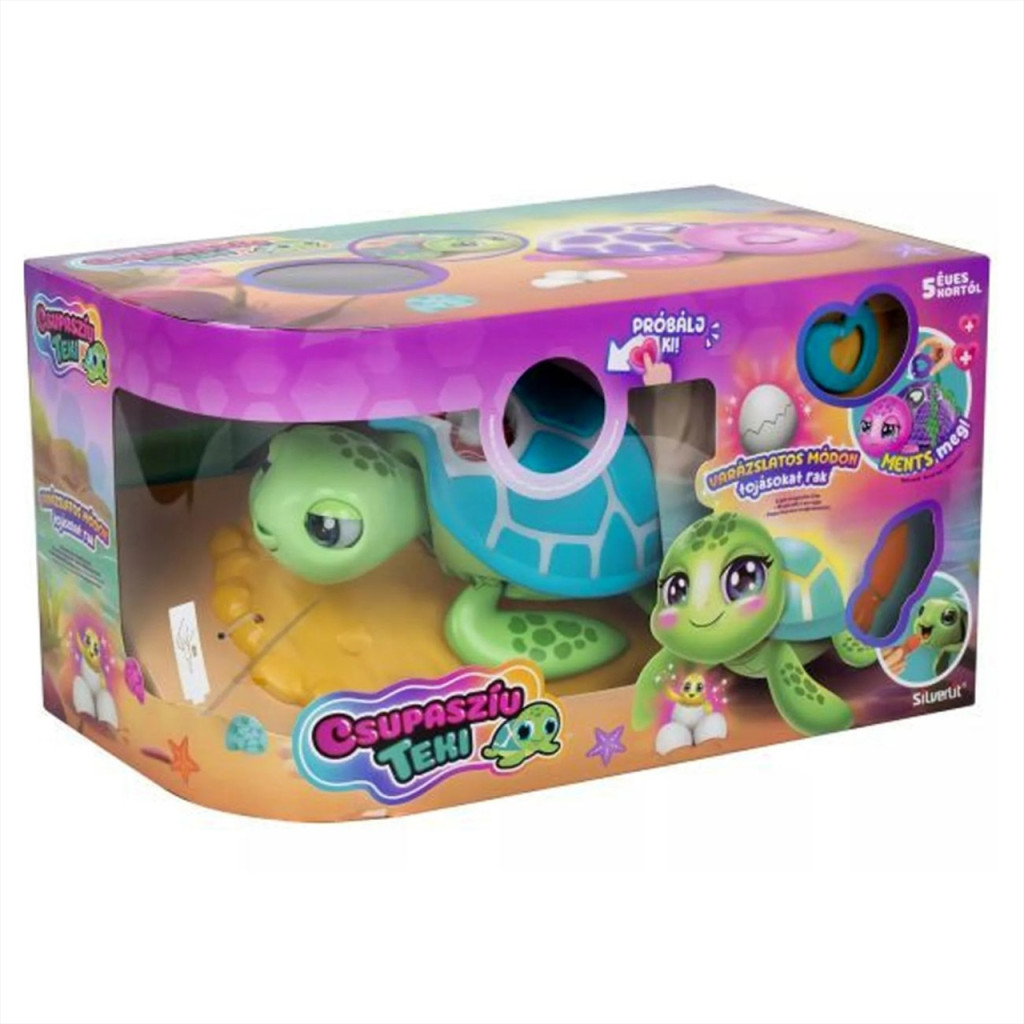 A Silverlit Csupaszív Teki egy bájos, interaktív kis teknős, aki csak arra vár, hogy valaki megmentse, gondoskodjon róla és szeretgesse. Hálából pedig tojásokat rak, amelyekben apró teknősök rejtőznek – a gyerekek így egy igazi életmentő és gondozó szerepébe bújhatnak.