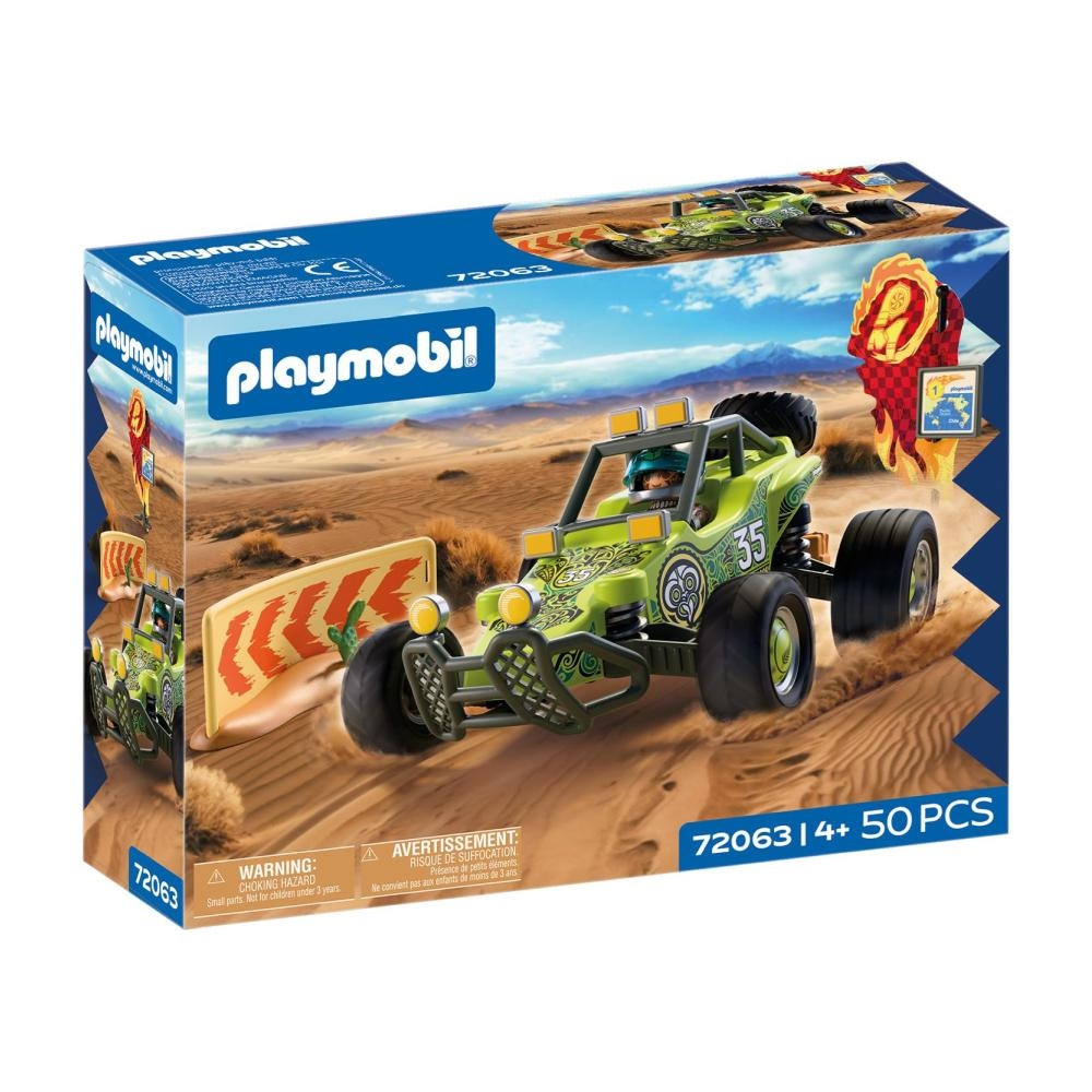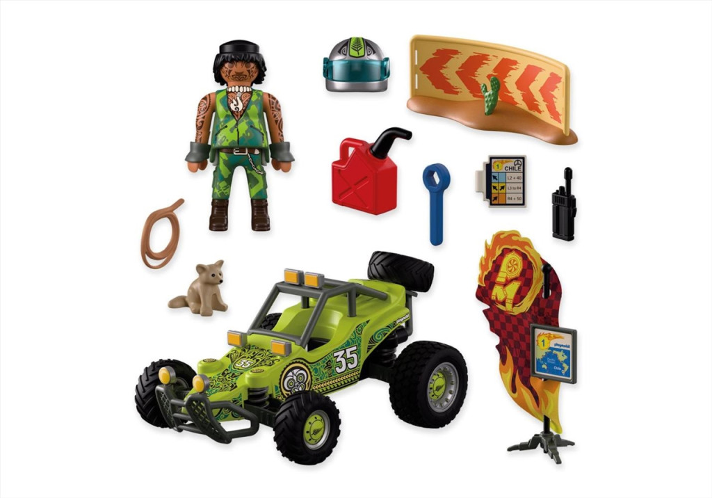 - A doboz tartalma: 1 versenyző figura, 2 sivatagi rókakölyök, 1 sisak, 2 karvédő, 1 offroad buggy, 1 pótkerék, 1 zászlórúd, 1 térkép, 1 információs tábla, 1 koffer, 1 benzines kanna, 1 walkie-talkie, 1 villáskulcs, 1 kötél, 1 korlát, 1 kaktusz.