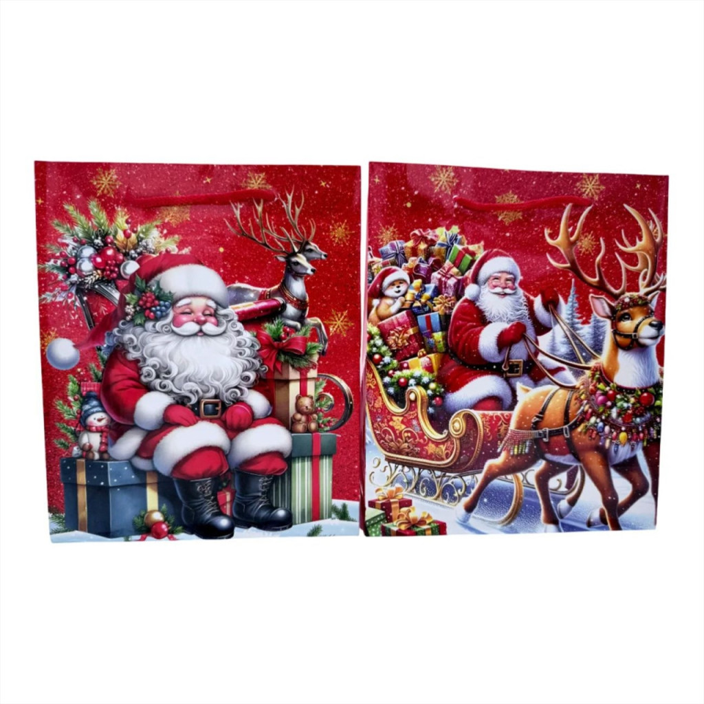 Mikulást ábrázoló ajándékzacskó szalagfüllel, hogy a meglepetés még vidámabb legyen. Környezettudatos választás, hiszen a szatyor többször is felhasználható, így kevésbé károsítja a környezetet, mint a hagyományos csomagolópapír.