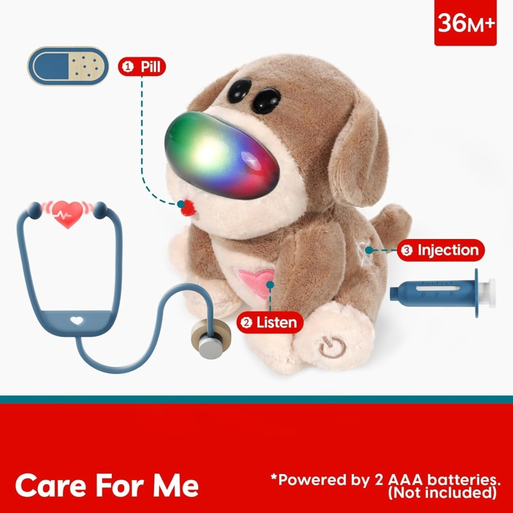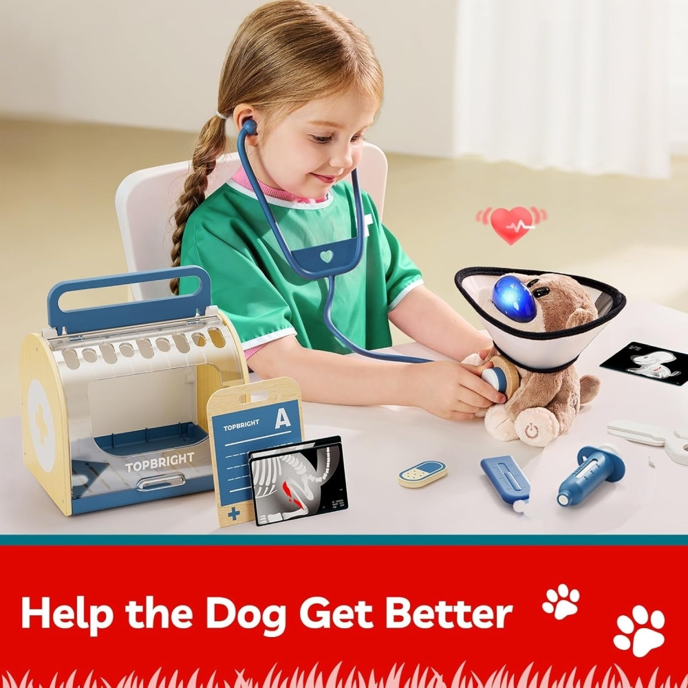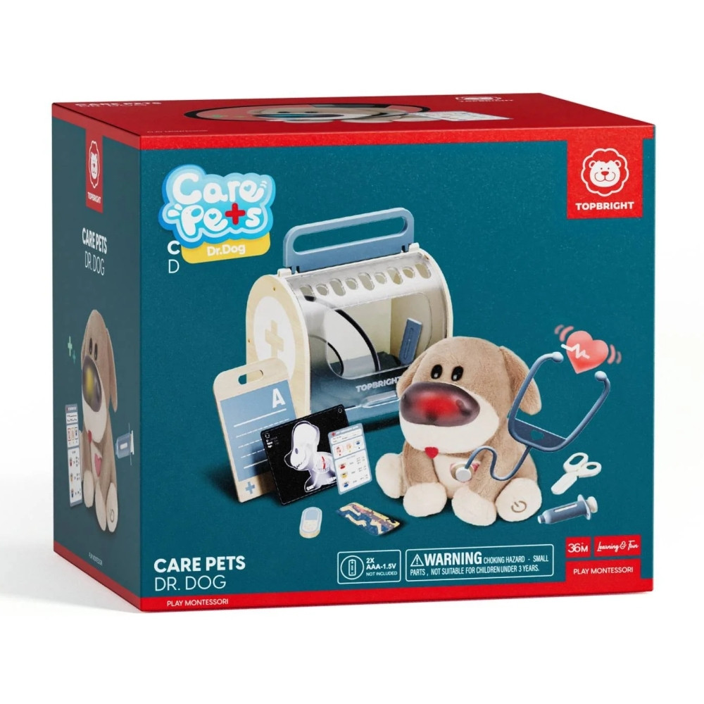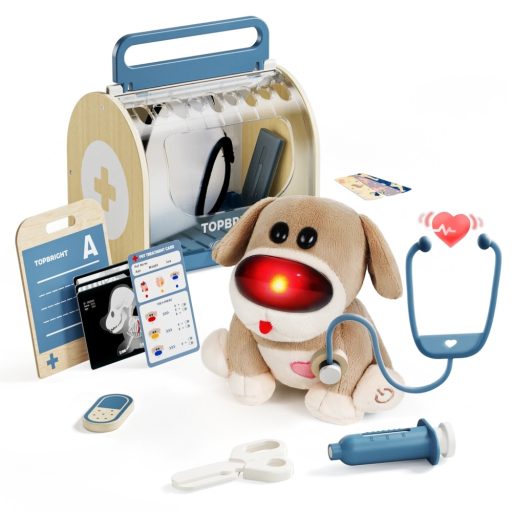 Ez a Topbright interaktív készlet a gyerekeket a gondoskodás és a kreatív játék világába vezeti be. A készlet tartalmaz egy puha plüss kiskutyát, amely reagál a környezetre: világít, hangjelzéseket ad és változó egészségügyi reakciókat mutat, amelyek a valódi háziállatok viselkedését utánozzák. A gondosan megtervezett orvosi eszközök, köztük a sztetoszkóp, a hőmérő és a játék fecskendő segítségével a gyerekek megismerkedhetnek a gondoskodással, a problémamegoldással és az érzelmek megértésével. A készletet úgy tervezték, hogy a valósághű, mégis játékos szerepjátékok révén támogassa a korai tanulást, a kreativitást és az önbizalmat.