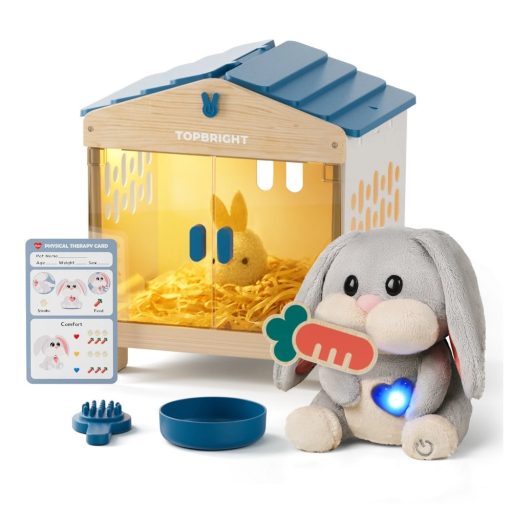 A Topbright puha, interaktív nyuszi játéka világít, hangokat ad ki és reagál az érintésre. A ragyogó szíve a gondoskodás hatására változtatja a színét, és a gondozási feladatok elvégzése után egy meglepetés kis nyuszi bújik elő a világító ketrecéből. A 3 éves és annál idősebb gyermekek számára tervezett, elemmel működő plüss nyuszi ösztönzi a szerepjátékot és az érzelmi tanulást olyan szórakoztató kiegészítőkkel, mint a fésű, a sárgarépa és az etetőtálka. Tökéletes azoknak a gyermekeknek, akik szeretik a cuki nyuszi játékokat, a hangot adó plüssállatokat és a varázslatos meglepetéseket.
