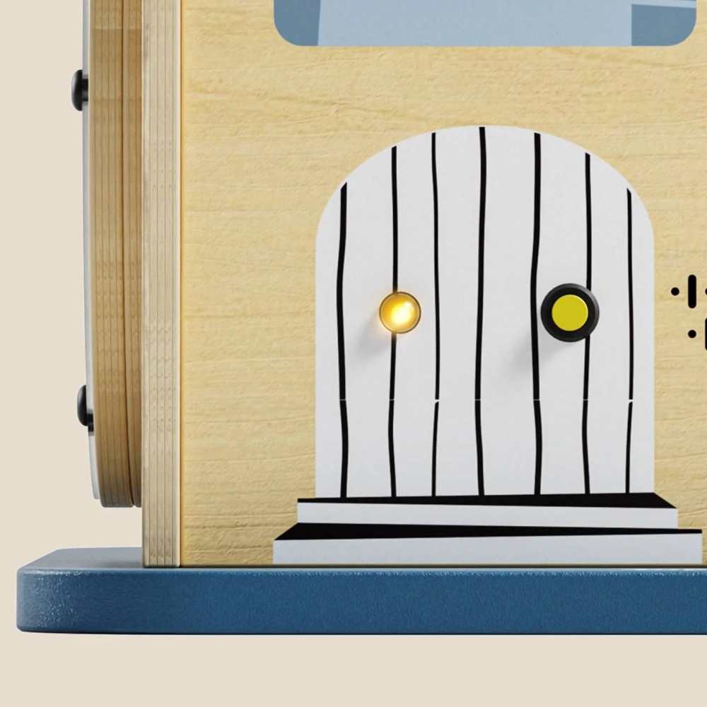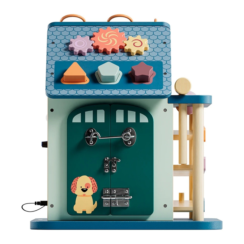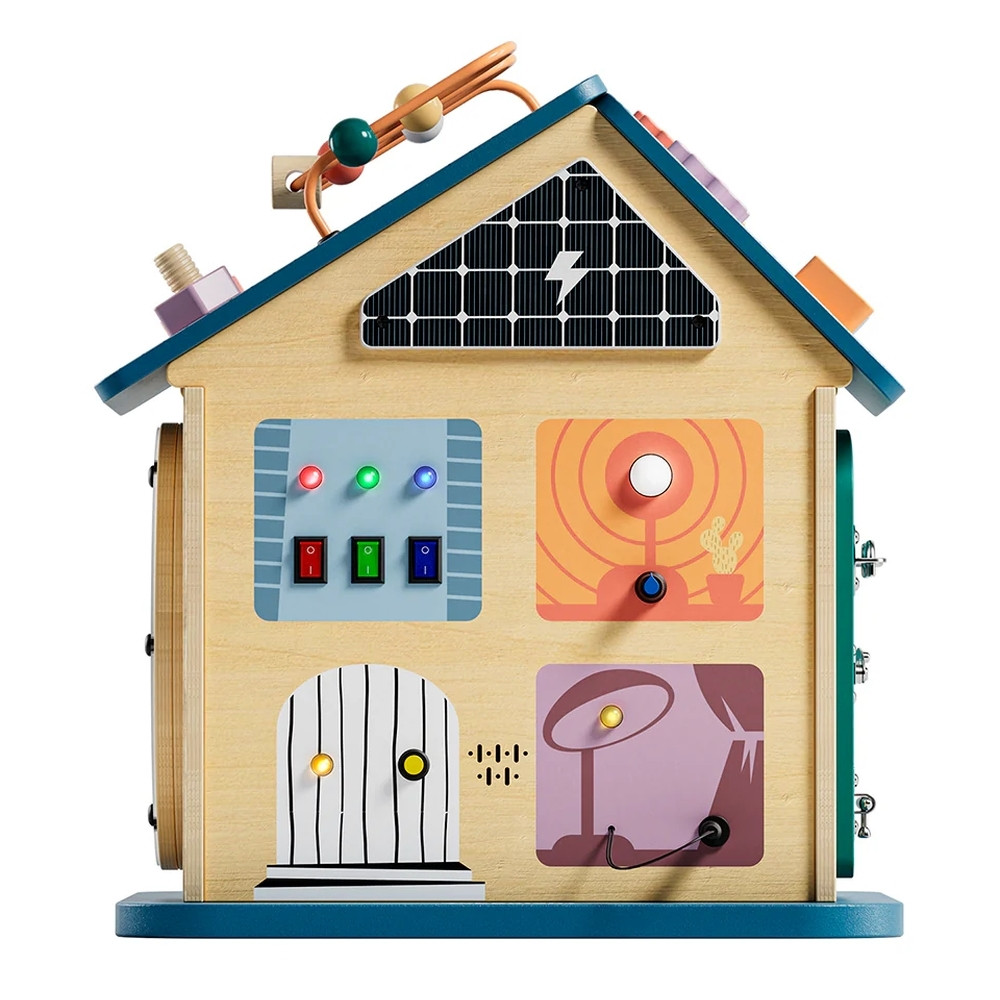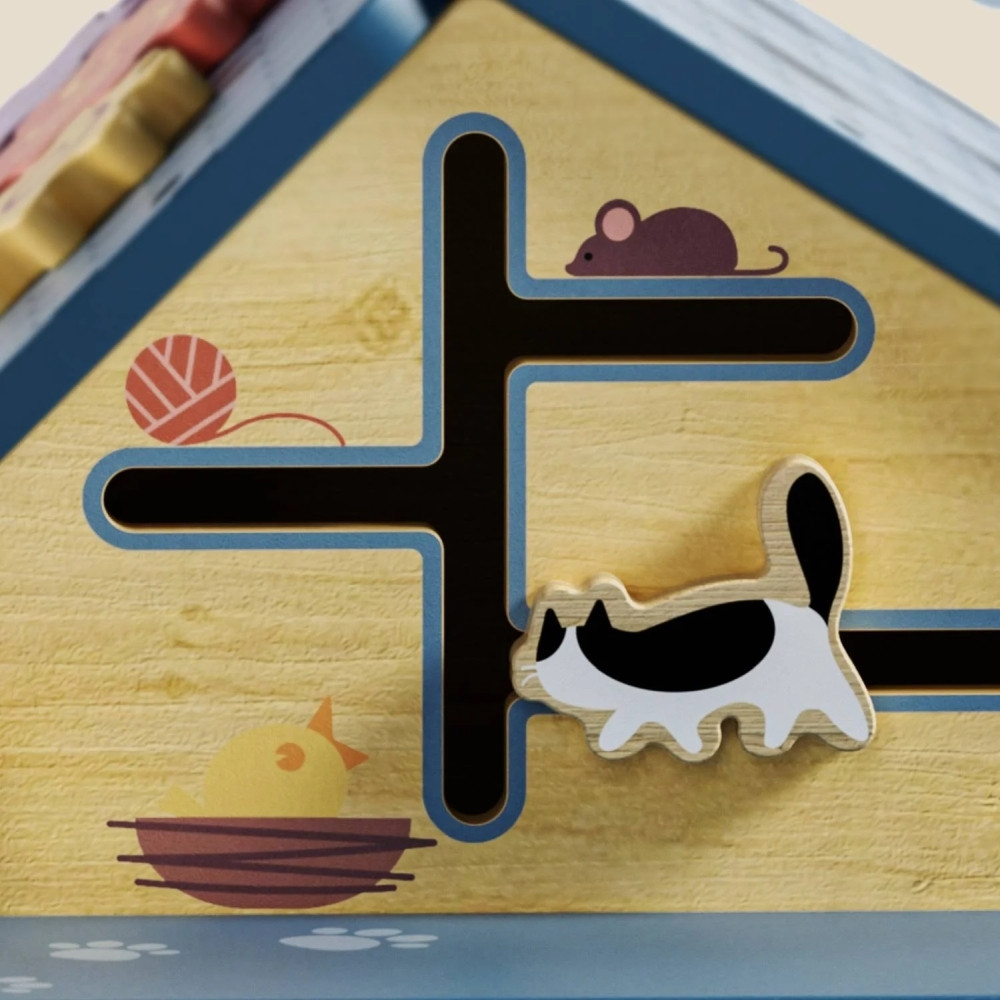 Ezen felül golyópályát, zárakat és lakatokat, formaválogatót, labirintus pályát és fényeket is tartalmaz a játék. Ennek a Montessori elven kialakított házikónak a célja a koordináció, a kreativitás és a problémamegoldó képesség fejlesztése. Szórakoztató érzékszervi tevékenység kisgyermekek számára.