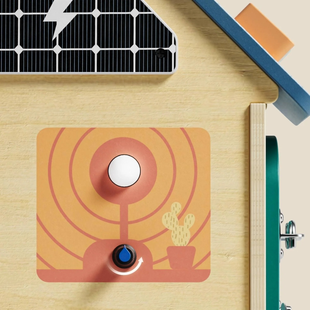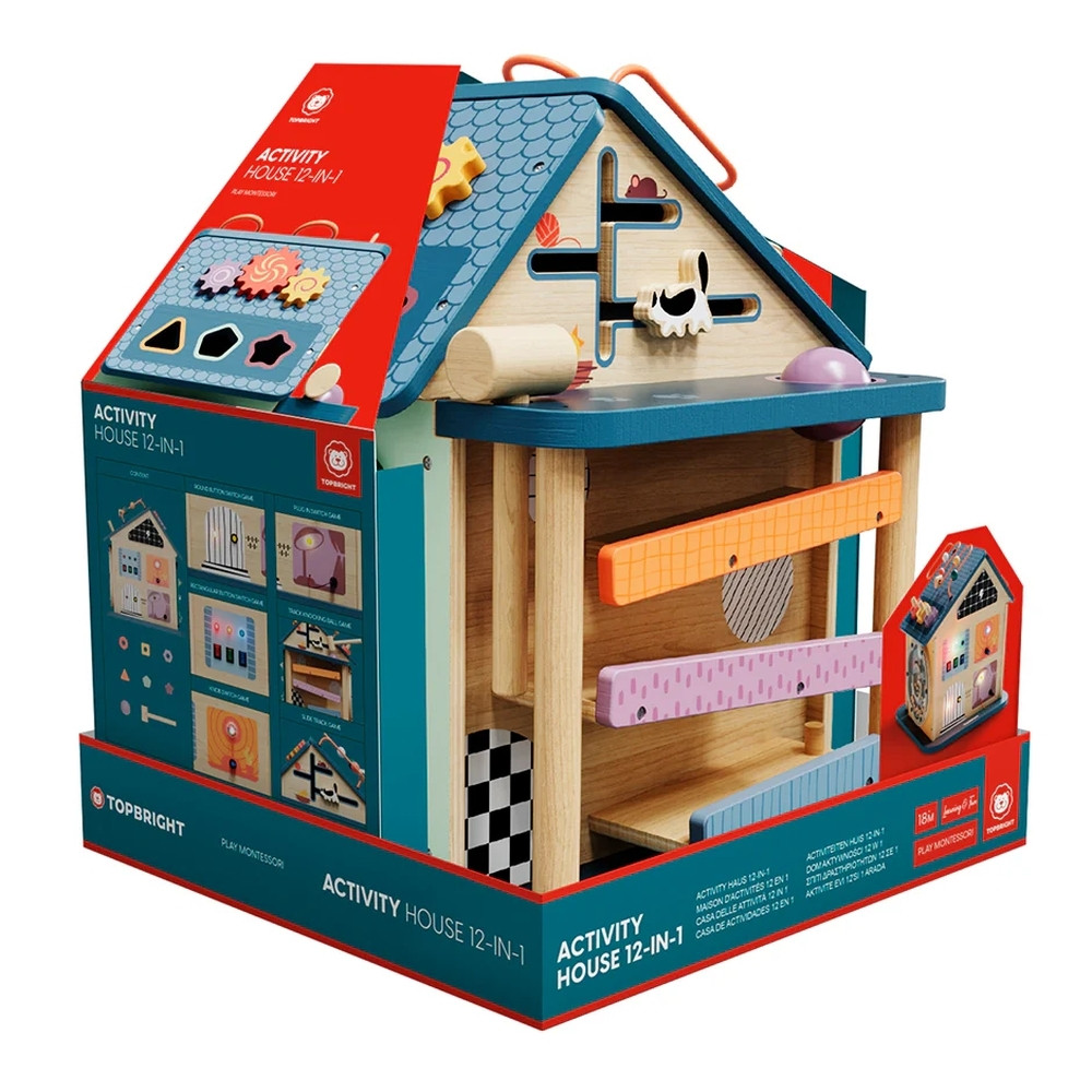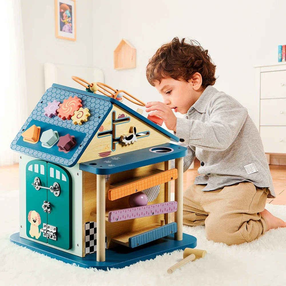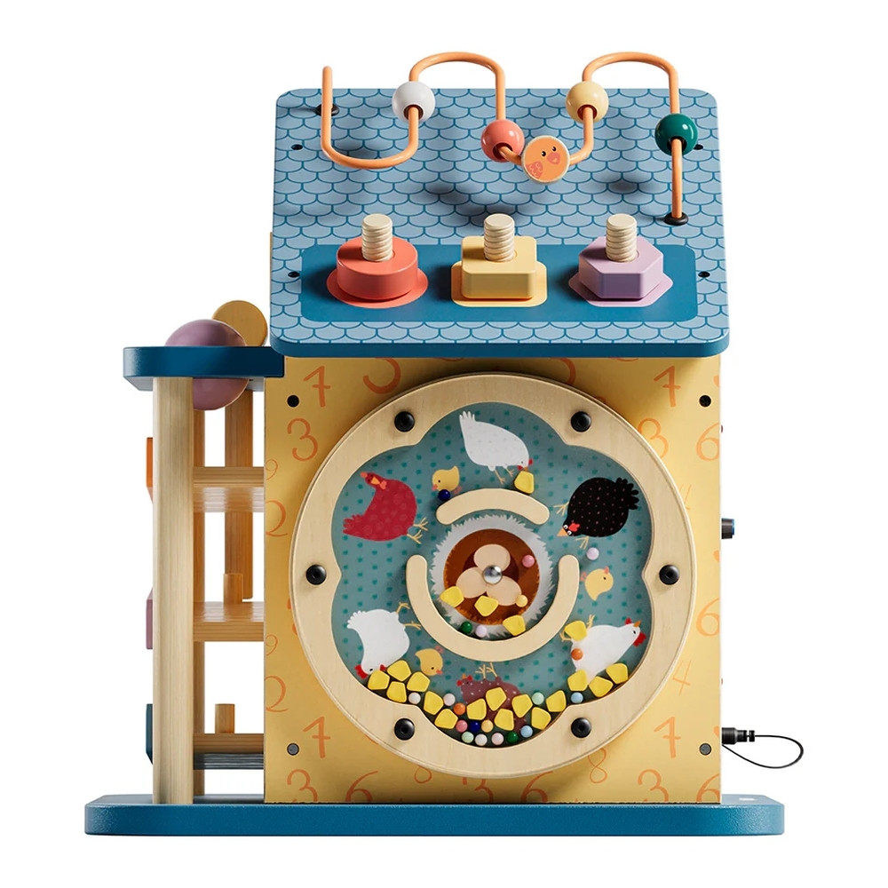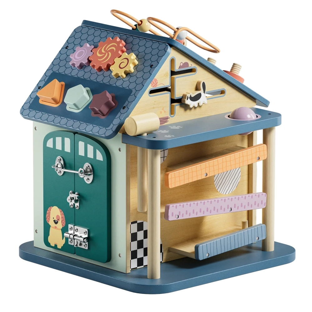 Ezen felül golyópályát, zárakat és lakatokat, formaválogatót, labirintus pályát és fényeket is tartalmaz a játék. Ennek a Montessori elven kialakított házikónak a célja a koordináció, a kreativitás és a problémamegoldó képesség fejlesztése. Szórakoztató érzékszervi tevékenység kisgyermekek számára.