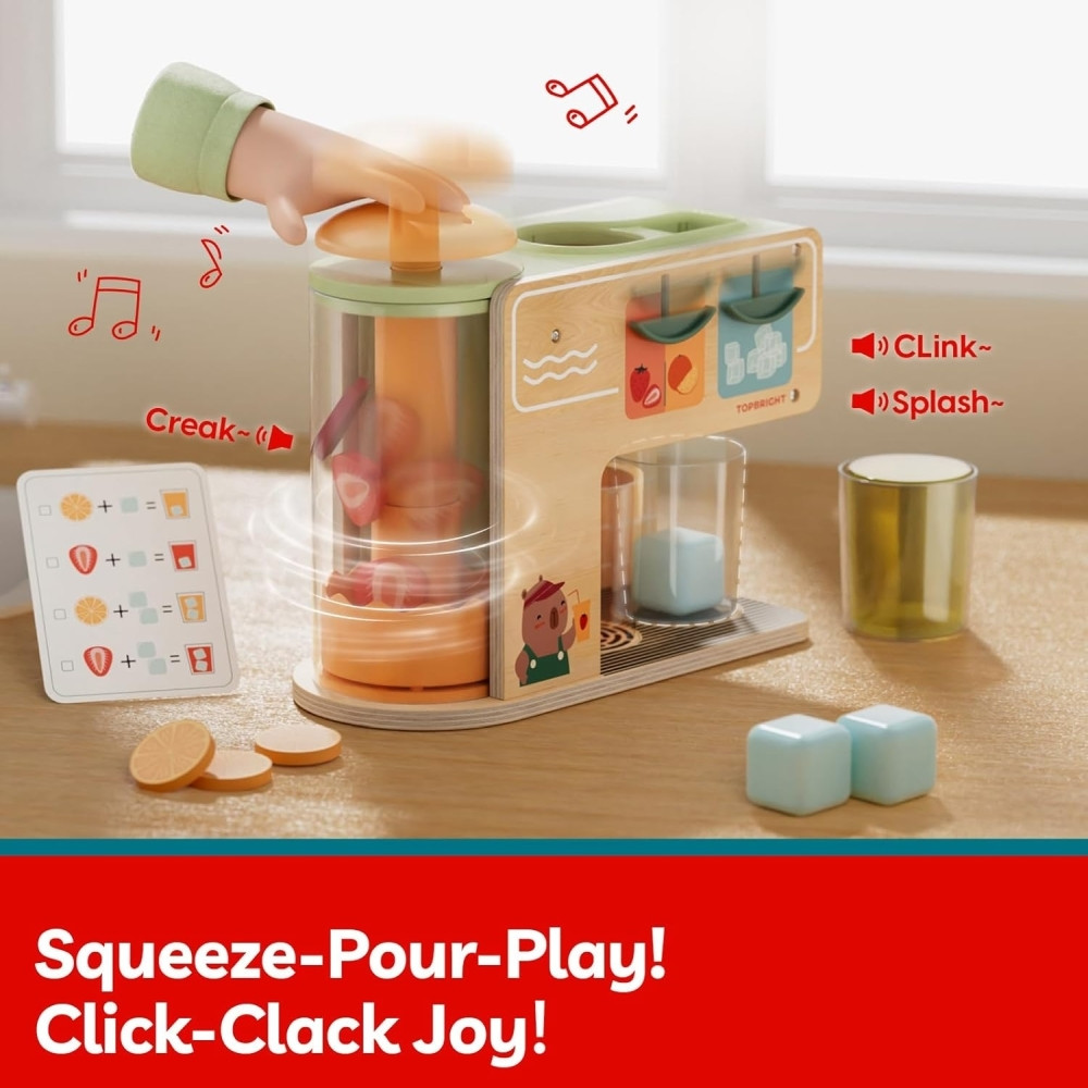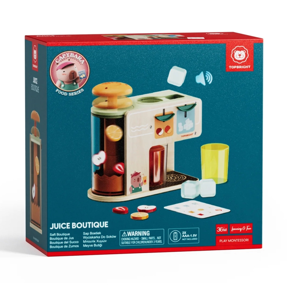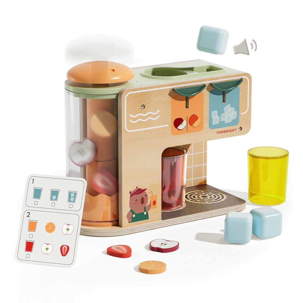 Ez a gyümölcslé bár interaktív funkciókkal egy Montessori szerepjáték, amelynek célja a kreativitás, a koordináció és az önbizalom fejlesztése. A gyerekek kis gyümölcslé-baristákként keverik össze a gyümölcsöket, a jeget és az italokat interaktív fa alkatrészek segítségével. A gyümölcslé bár oldalán egy turmix található, amelyben a gyümölcsszeletek forognak. Az átlátszó pohárba 2 féle színes betét pottyantható, a különböző gyümölcslevek vizuális megjelenítése céljából. A jégkocka adagoló funkcióval a gyerekek felfedezhetik a kockák potyogásának hangját. Tartós, gyermekbiztos anyagokból készült fajáték, amely fejleszti a finommotorikus képességet és a kooperatív játékot. Képernyőmentes szórakozást nyújt, amely ideális játékkonyhák kiegészítésére, játszószobákba és tanulási terekbe.