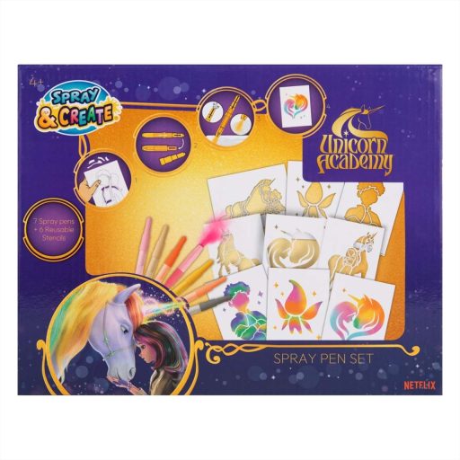 A Canenco Unikornis Akadémia festékszóró filc kreatív szett egy igazán izgalmas alkotókészlet, amellyel a gyerekek nem rajzolnak – hanem „festenek a levegővel”!