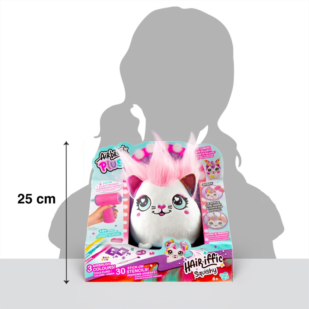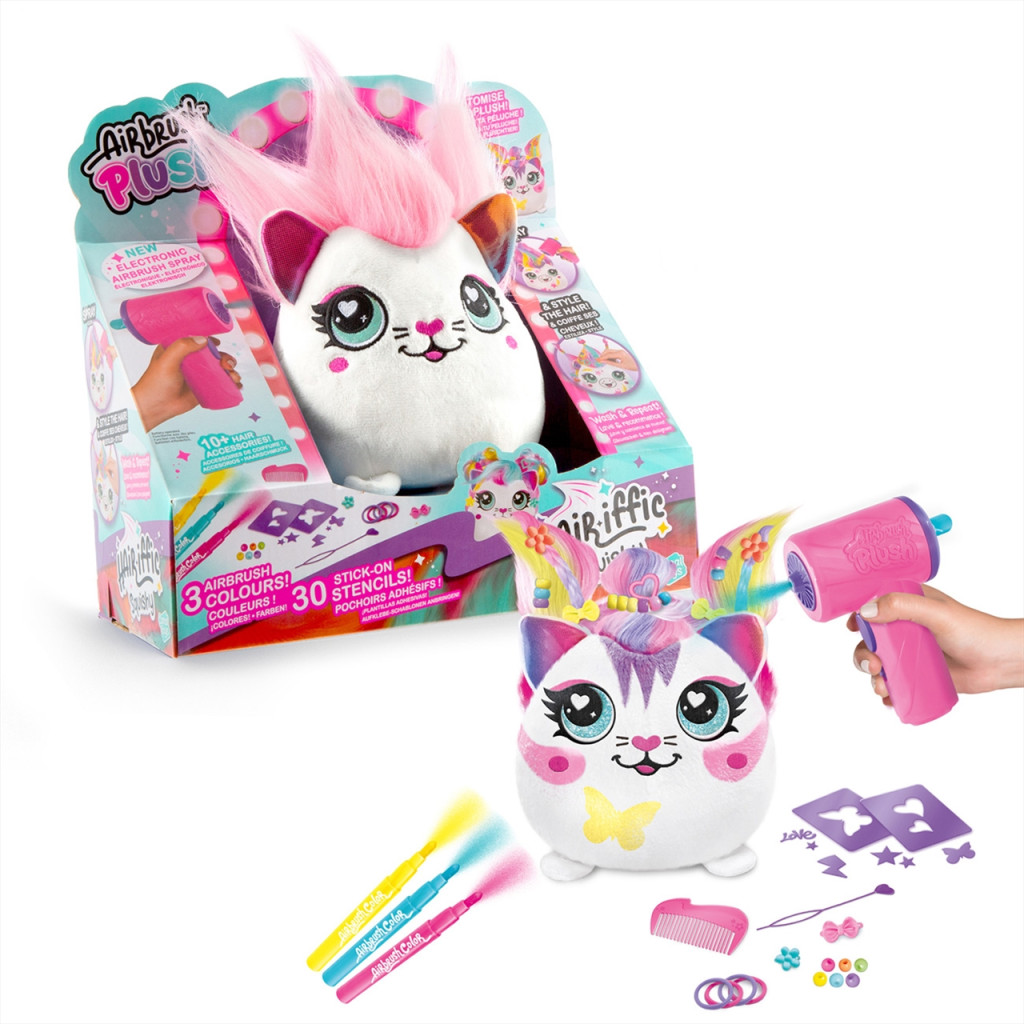 A hófehér Airbrush plüss pajtások csak egy jó barátra vágynak, aki színt visz a mindennapjaikba! Válassz egy színt a festékfilcek közül, helyezd a festékszóróba, és indulhat is a móka. Színezd a plüss állatkát kedved szerint. Színezd ki a dús hajkoronáját, és varázsolj neki pompás frizurát. Válassz a stencilek közül, hogy izgalmas mintákkal dobd fel a bundáját. Játék után pedig könnyen lemoshatod a dizájnt, hogy holnap új stílussal indítsátok a napot.