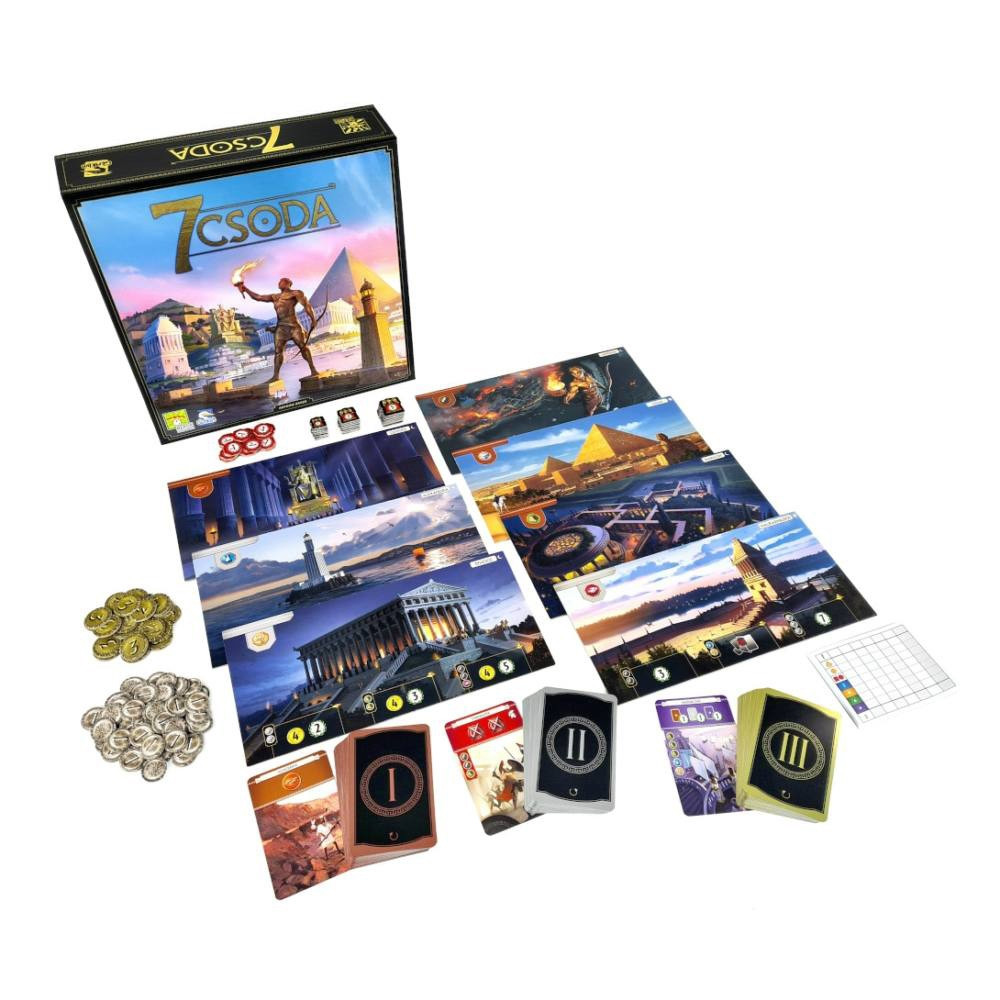 A 7 Csoda kártyás stratégiai játék, amelyben az ókori világ hét csodáját építhetjük fel, ám ebben a rendkívül pörgős, színes, ötletes civilizációs kártyajátékban a hét csoda megépítése csak az egyik útja a pontszerzésnek. Rengeteg izgalom, taktika és stratégia, egy mindössze félórás játékban. Minden játékos hét kártyát kap a kezébe, amelyek közül kiválaszt egyet, amit ki kell játszania, és a maradék lapot át kell adnia a mellette ülő játékostársának. A játék három fő korszakból áll, és korszakonként mindenki hat lapot játszhat ki. Ezekkel különböző előnyökhöz juthatnak, ám azzal is számolniuk kell, hogy a másnak adott lapok hogyan hatnak majd a saját fejlesztéseikre! Könnyen tanulható szabályai és játékmenete miatt ugyanolyan kihívást és élményt jelent a tapasztaltabb játékosok számára, mint azoknak, akik csak most kezdenek ismerkedni a társasjátékok magával ragadó világával. Az újszerű játékmechanika miatt ugyanolyan jól játszható 3-7 főig bármilyen játékosszámmal, sőt a mellékelt kiegészítő szabályokkal akár ketten is remek szórakozás lehet. A sokféle stratégiával számos út vezethet a győzelemhez, nem igazán van két egyforma parti. A gyönyörű alkatrészekkel pedig élmény a játék! Ebben a legújabb kiadásban már minden szöveg, így a kártyák elnevezése is magyar nyelvű!