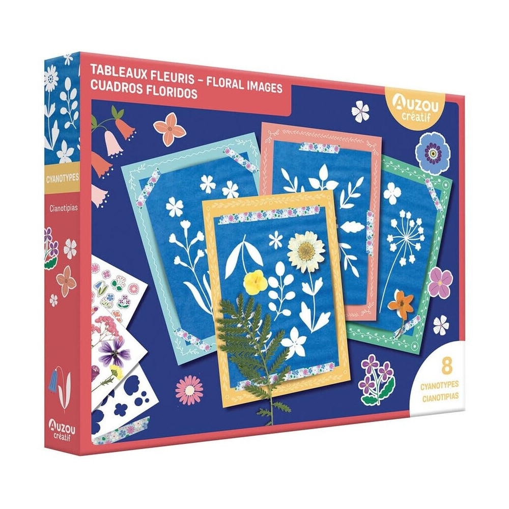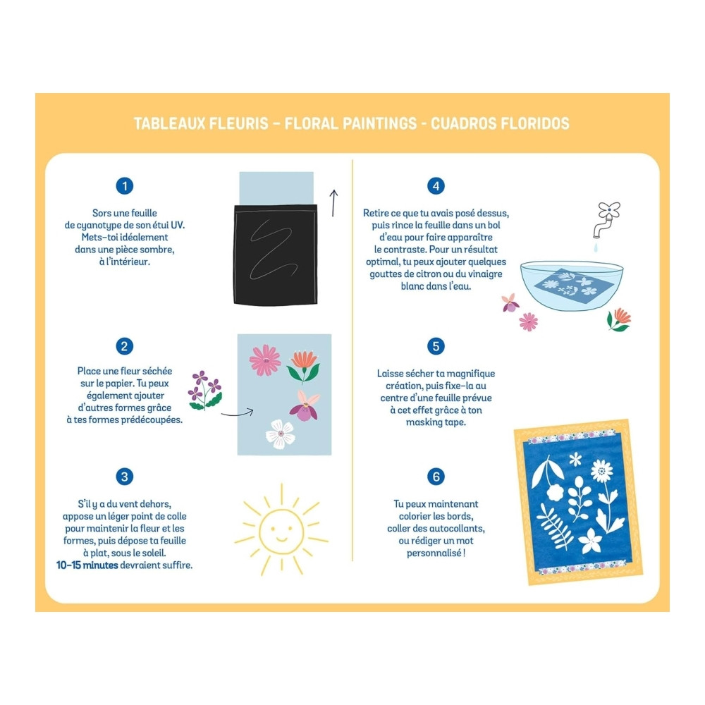 Készíts 8 gyönyörű cianotípia (kéknyomat) képek a fényérzékeny papír, a szárított virágok, a sablonok, a maszkolószalag és a matricák segítségével!