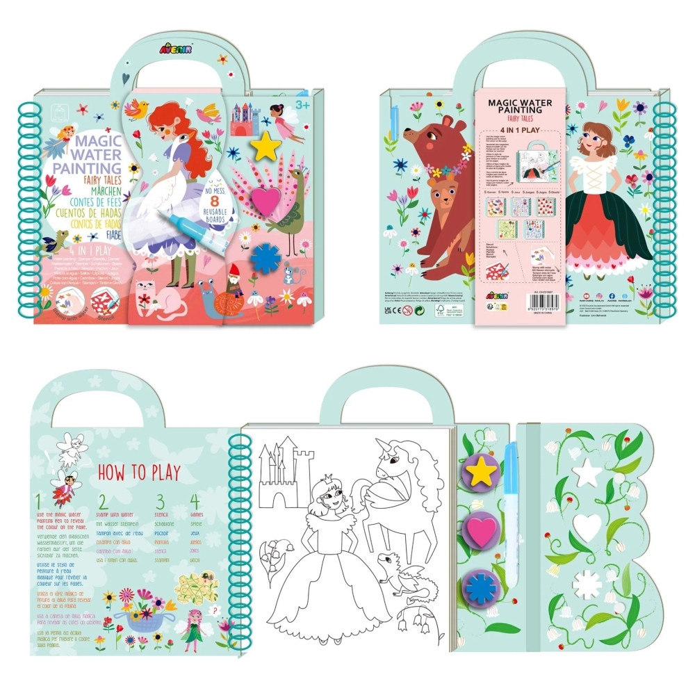 Színezd ki a fehér képeket a vizes ecset segítségével, mely a könyvben található. A játékhoz nem kell festéket használnod! A kép amikor megszárad, visszafehéredik így újra és újra kiszínezheted a "varázstolladdal". Használd a varázs nyomdákat is, melyeket szintén a könyv belsejében találsz.
