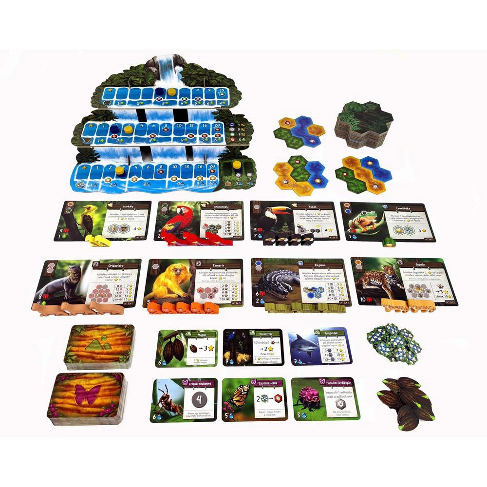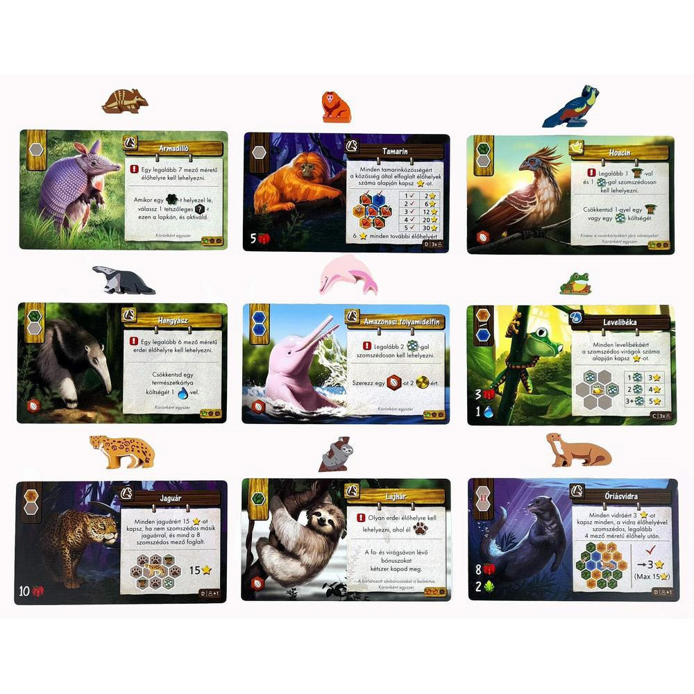 Óvd meg az esőerdő élővilágát!Az Amazónia összetettebb, akcióválasztós családi társasjáték rengeteg különleges alkatrésszel. A játékosok harmonikus természetvédelmi területet építenek ki az őserdő állatai és növényei számára.