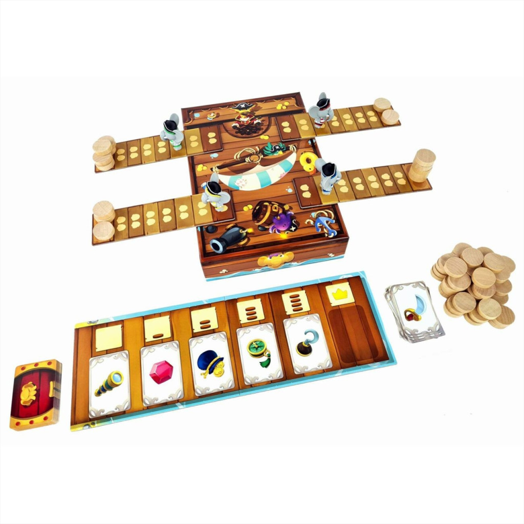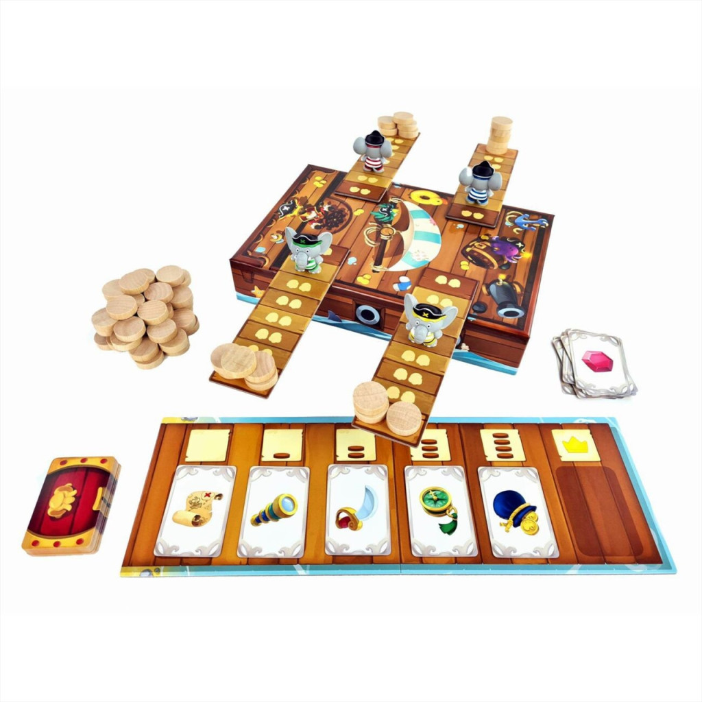 - 49 kincskártya – 1 pontontábla – 4 kalóz elefánt figura,