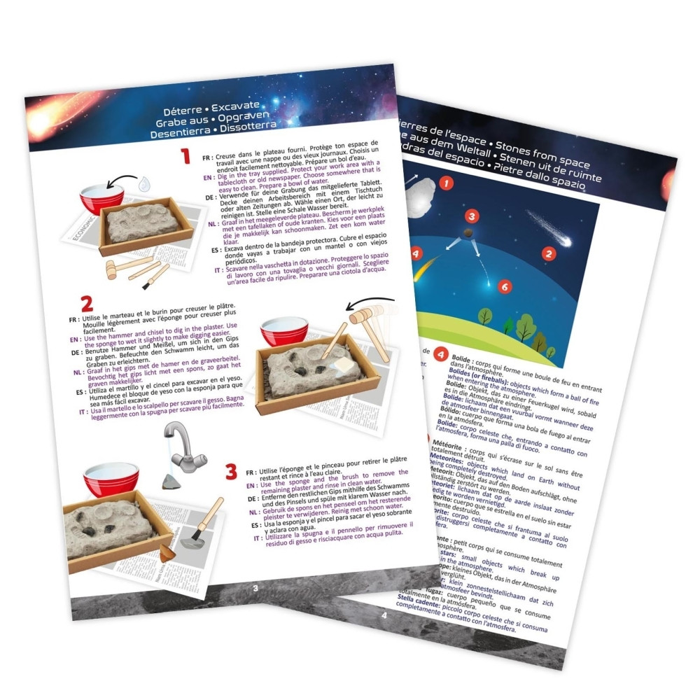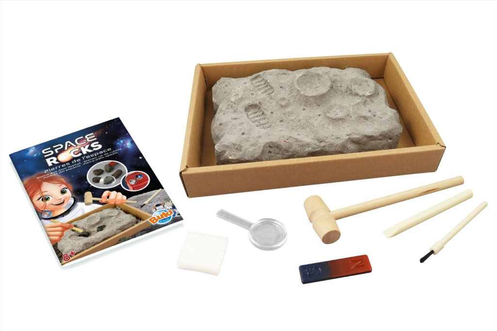 A szerszámok segítségével áss ki, és figyelj meg öt, az űrből származó követ. Talász köztük egy valódi kőmeteoritot, valamint tektit (meteorit) marokköveket is.