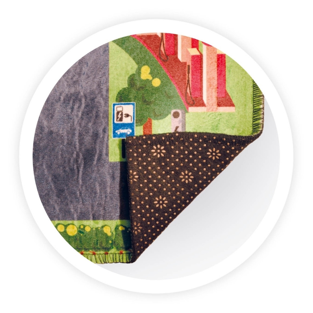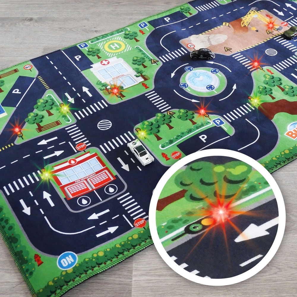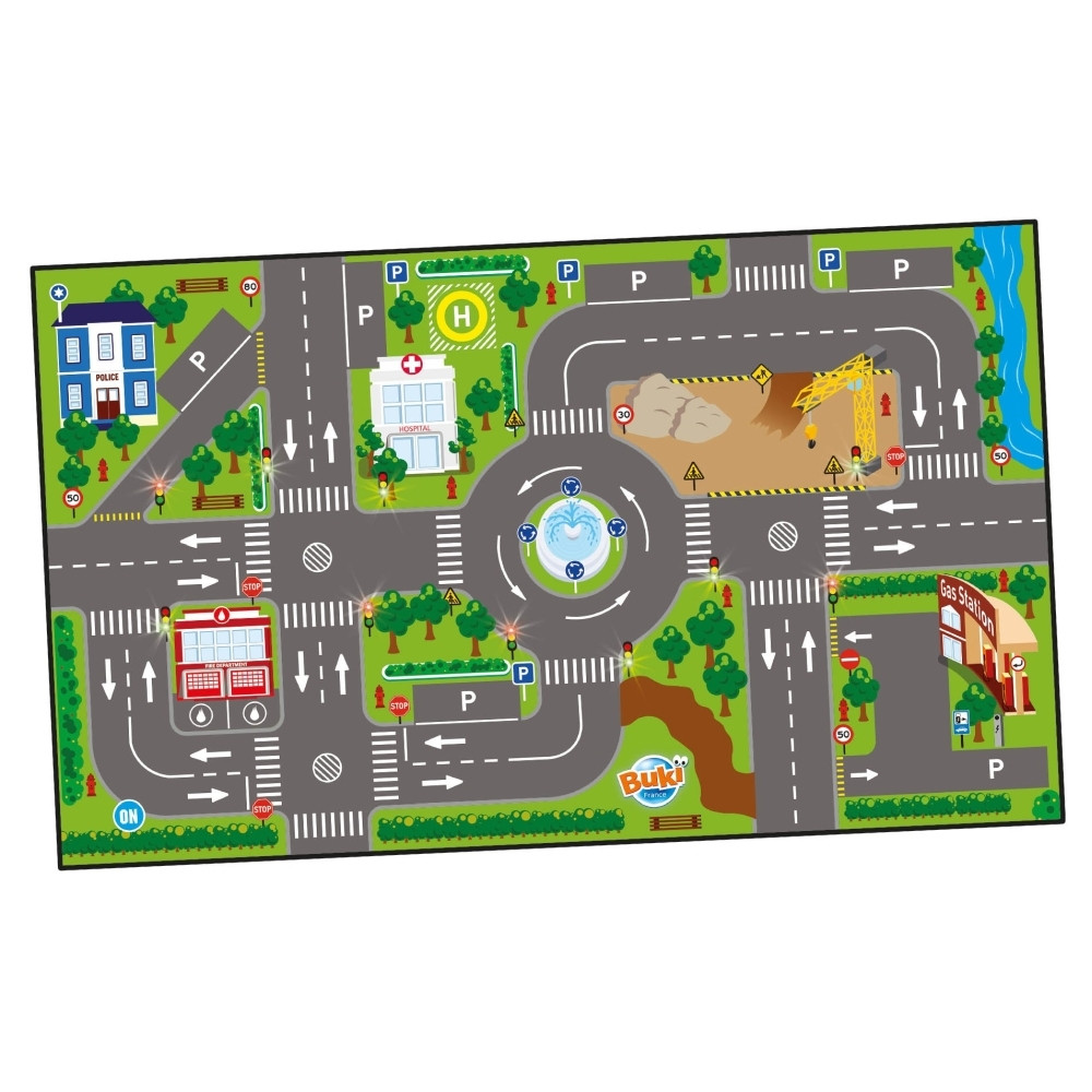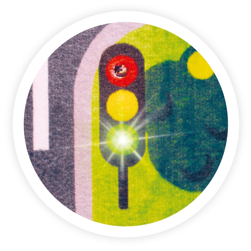 A gyerekek városi környezetben vezethetik kisautóikat, miközben megismerkedhetnek a közlekedési lámpákkal, stoptáblával, parkolóhelyekkel és gyalogátkelőhelyekkel. A szőnyeghez 3 db kisautó is tartozik (véletlenszerű modellek). A játék világító funkciójához 2 db CR2032 elem szükséges.