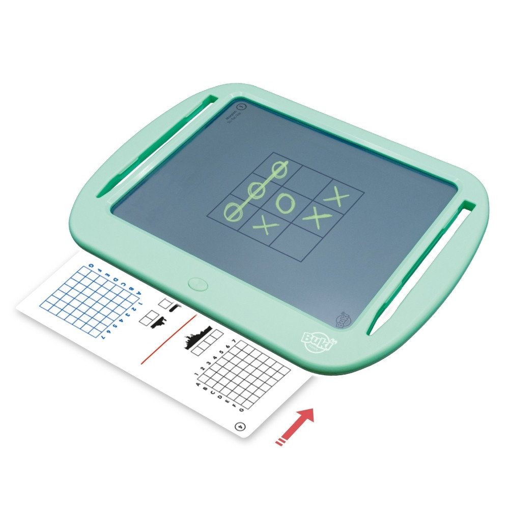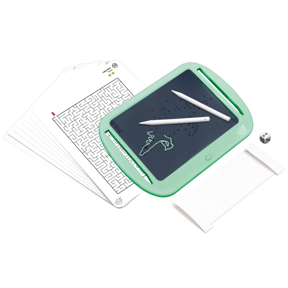 Helyezz be egy kártyát a táblagép alá, és már kezdődhet is a játék! A mellékelt két tollal írhatsz vagy rajzolhatsz a táblára. A tablet hátulján található kis gomb megnyomásával törölheted egy mozdulattal a képernyőt, és elkezdhetsz egy új játékot.