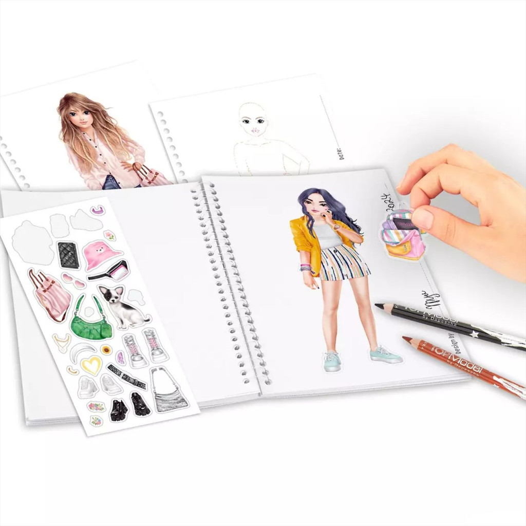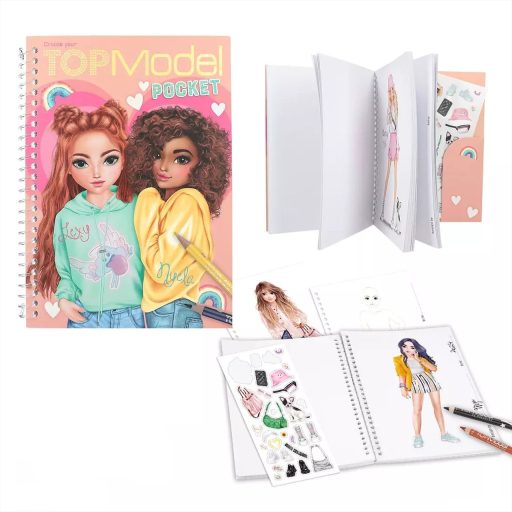A fényes borítójú TOPModel Pocket kifestőkönyv 120 oldalon, fantáziával és színekkel formázható modellfigurákkal. Tartalma: 1 db matricalap divatos kiegészítőkkel.