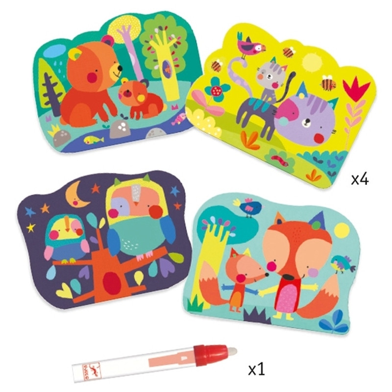 A Djeco in the woods - Vízzel színező, Bújócska az erdőben egy pompás, különleges színező készlet, ahol egy kis varázslatra is szükség lesz, hogy megelevenedjenek a mesés világ szereplői és részletei. Csak töltsd meg a tollat vízzel, válassz ki egyet a 4 színező lap közül, és már kezdődhet is a móka, amivel az erdől lakói fedik fel magukat rejtekükből. Megismerkedetsz a mamamacival és a bocsával, a rókákkal, és több más állatkával. Töltsd meg vidámsággal a virágoskertet. A Djeco színezőt 18 hónapos kortól ajánljuk.