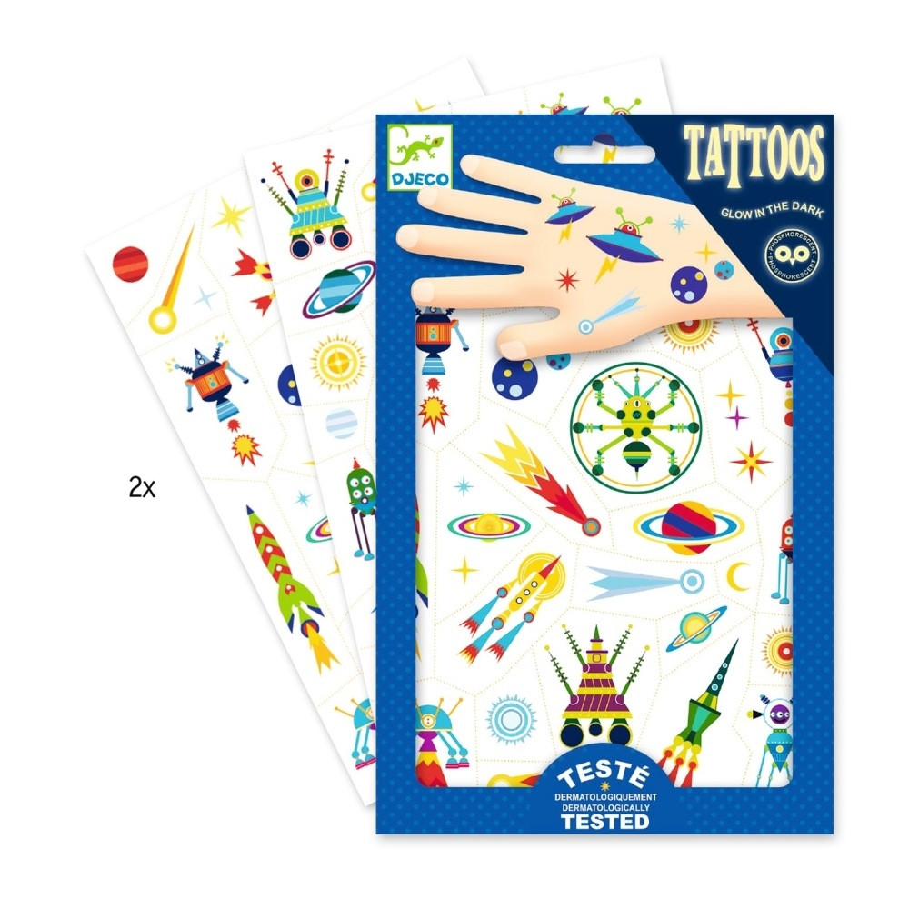 Varázsolj mesés világűr témájú tetoválásokat a karodra, lábadra, vagy akár füzetborítódra. A Djeco Tattoos, Space oddity - Tetováló matricák, Égi furcsaságok szett két íven tartalmaz több tucat ábrát, melyek között bolygókat, üstökösöket, rakétákat, űrhajókat, csillagokat és még ufókat is találsz.