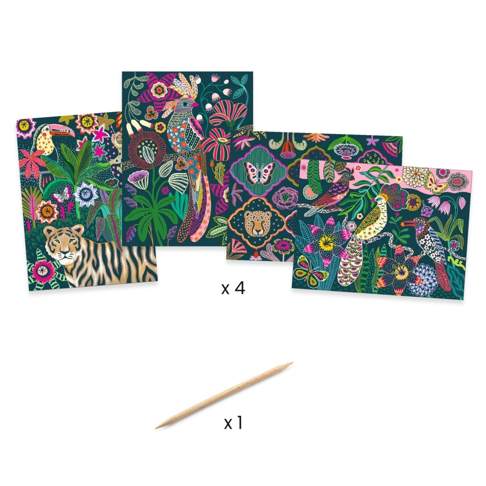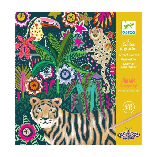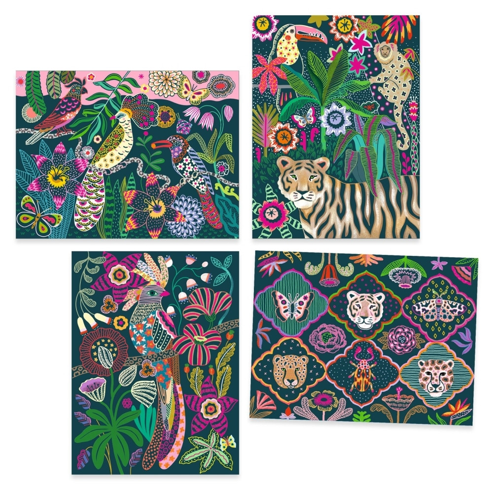 4 db foszforeszkáló karckép az Édes éden témában. A gyermek a művész által elképzelt mintákat reprodukálja úgy, hogy a felületet a fa karcoló ceruzával megkarcolja. Fokozatosan varázsütésre feltárulnak az illusztrációk!