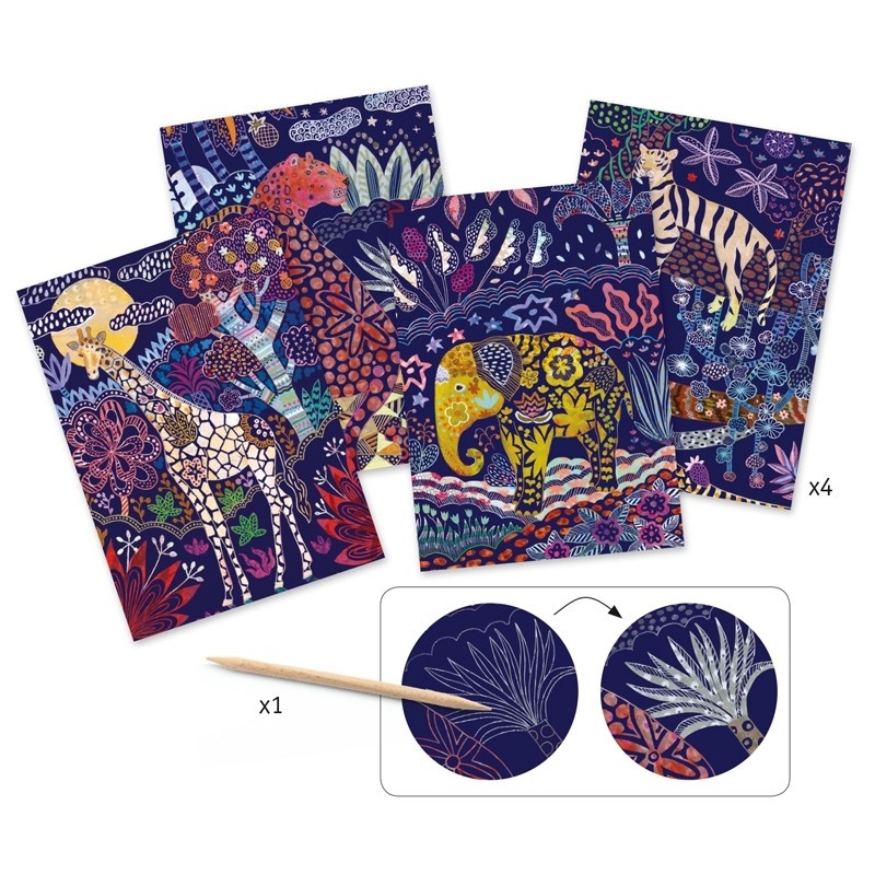 Fedezz fel titkokat karckép technikával! A Djeco Lush nature - Karckép technika, Buja természet csomag négy viaszos alaplapot rejt, mely egy elvarázsolt világba kalauzol el téged, ahol Afrika legendás állataival találkozhatsz, akiket meseszép motívumok díszítenek. Minden részlet feltárul, ha a vonalakat követve a megfelelő helyen kaparod a viaszos alapot. Ehhez egy két oldalú tompa karcolót is rejt a csomag. A terméket 7 éves kortól ajánljuk.