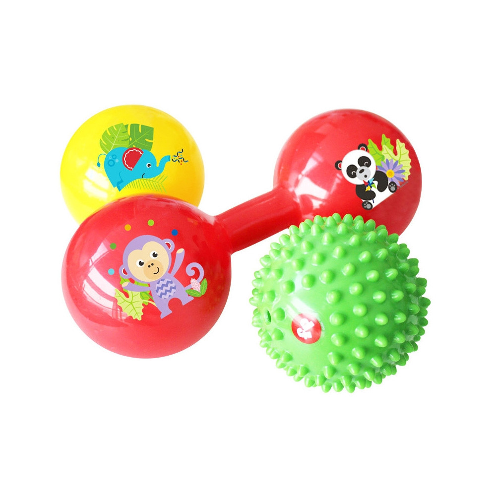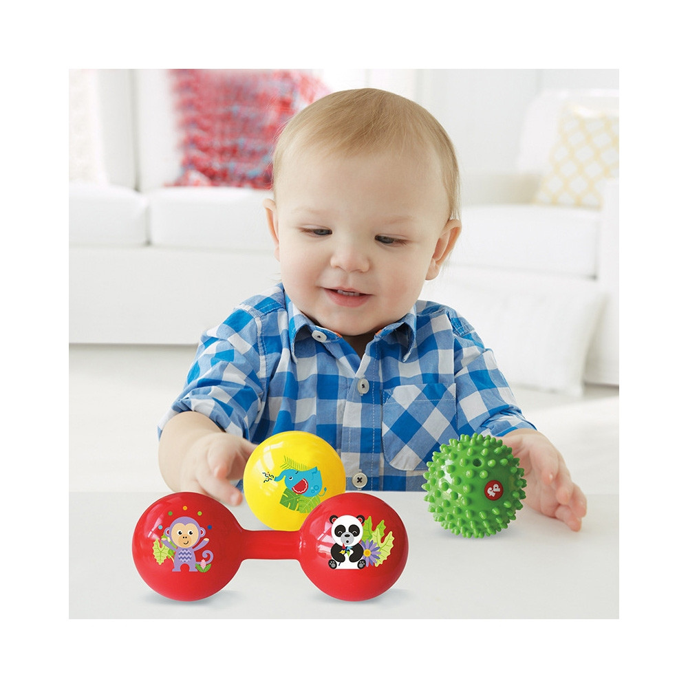 A három részes, mókás Fisher-Price érzékszervi készlet biztosítja a mozgást és edzést gyerkőc módra. Tartalmaz egy sima felületű majmócás labdát, egy életlen, tompa tüskés labdát és két összekapcsolt labdát kedves panda és oroszlán mintával, amit úgy markolhatnak át a kicsik, akár a felnőttek a súlyzókat. Mindhárom elem kellemesen puha. Már baba kortól fjlesztik a tapintást, érzékelést és koordinációt.