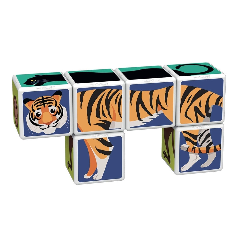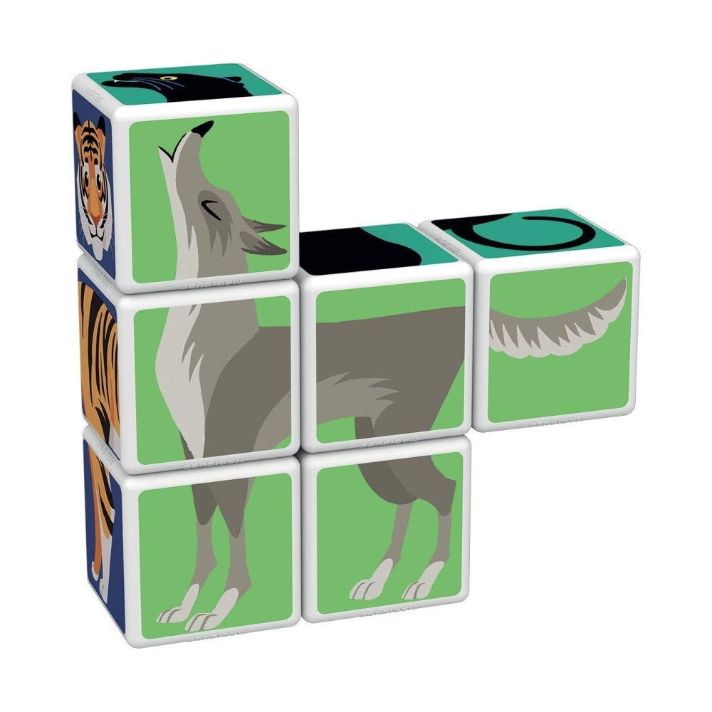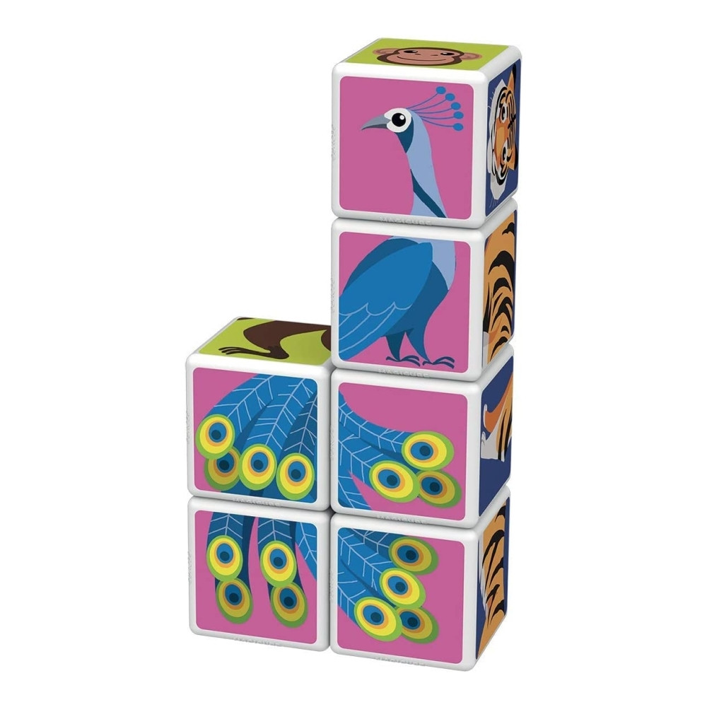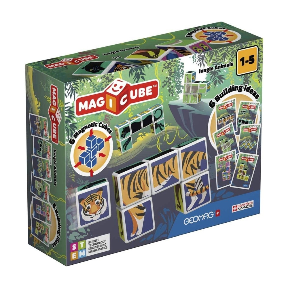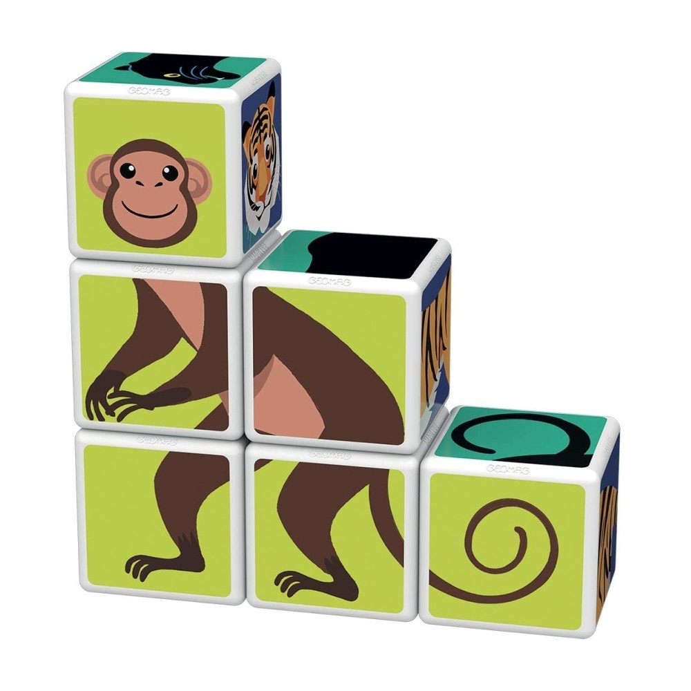 A doboz 6 db mágneses Geomag kockát tartalmaz, amelyek összeillesztésével 6 különböző állat (majom, párduc, páva, kígyó, tigris, farkas) térbeli képét lehet kirakni. A kockák mind ideális méretűek a gyerkőc kezeibe, így könnyen meg tudja őket fogni és összeilleszteni.