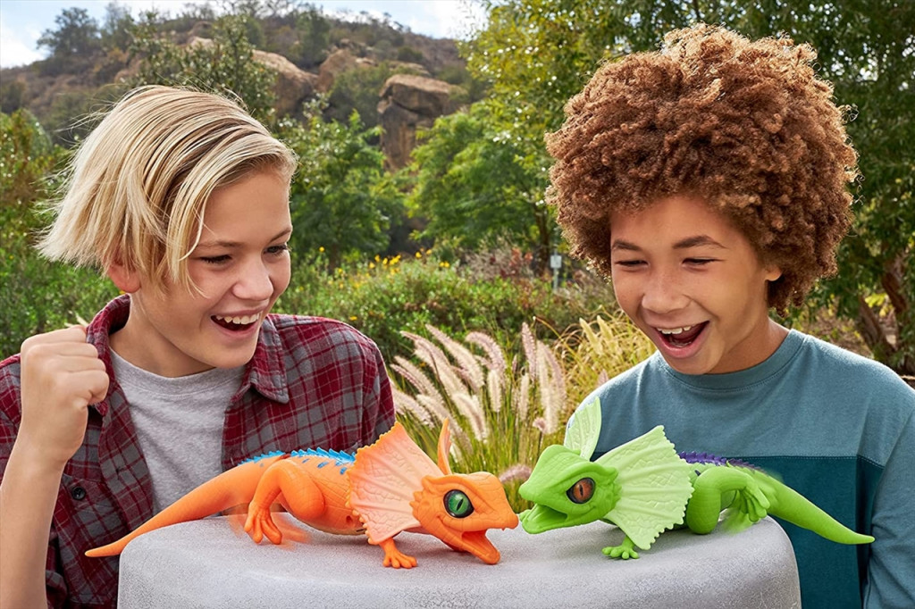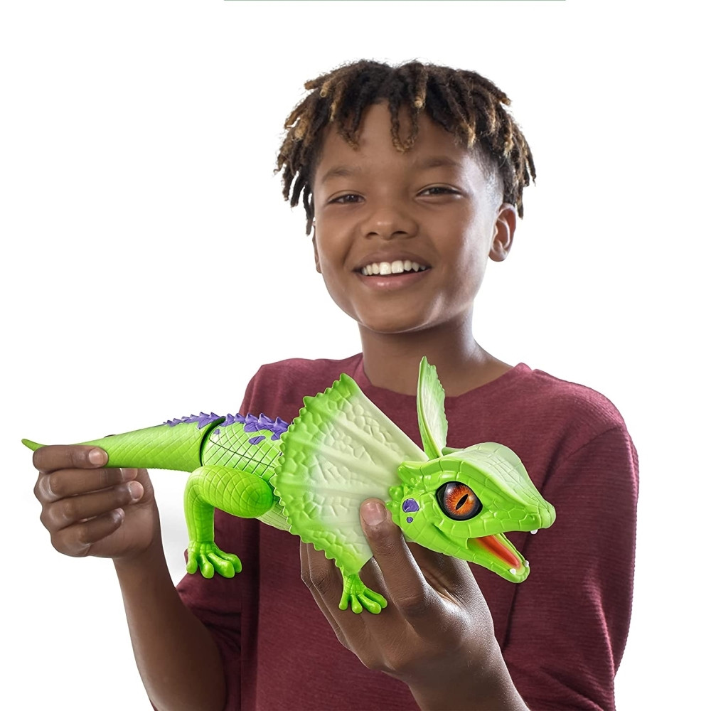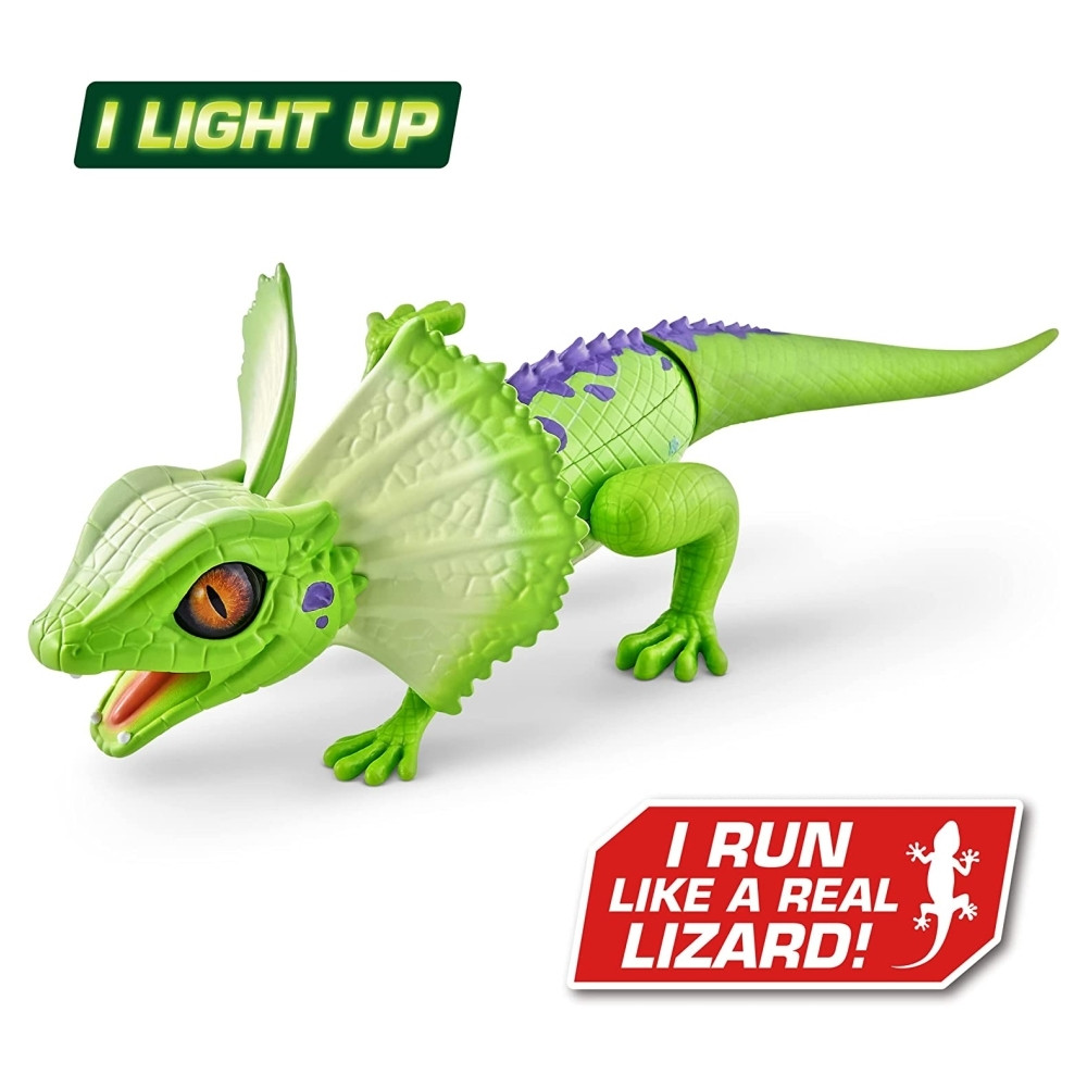 Fedezd fel a gyíkok életét ezzel az élethű robot állattal, aki pont úgy mozog és viselkedik, mint az igazi. Kapcsold be, tedd le a földre és figyeld, hogyan cikázik össze-vissza. Fejét és farkát puha gumi borítja, érintése olyan, mint az igazi állat bőrének. Szája világít a sötétben, hogy távol tartsa a nagyobb ragadozókat. A gyík gyorsan szalad és támadásra készen mozgatja a fejét. A robottechnológia lehetővé teszi, hogy a leggyorsabb ragadozókat is megelőzve rohanjon – vajon te, el tudod fogni?