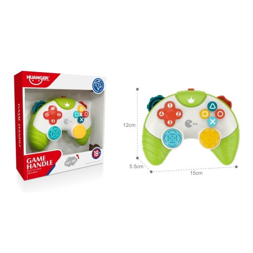 A kontrolleren találsz számbillentyűt, recsegő hangot adó gombot, világító kapcsolót, joystick jellegű gombot és olyat is ami kellemes zenét kapcsol a baba szórakozását biztosítva.