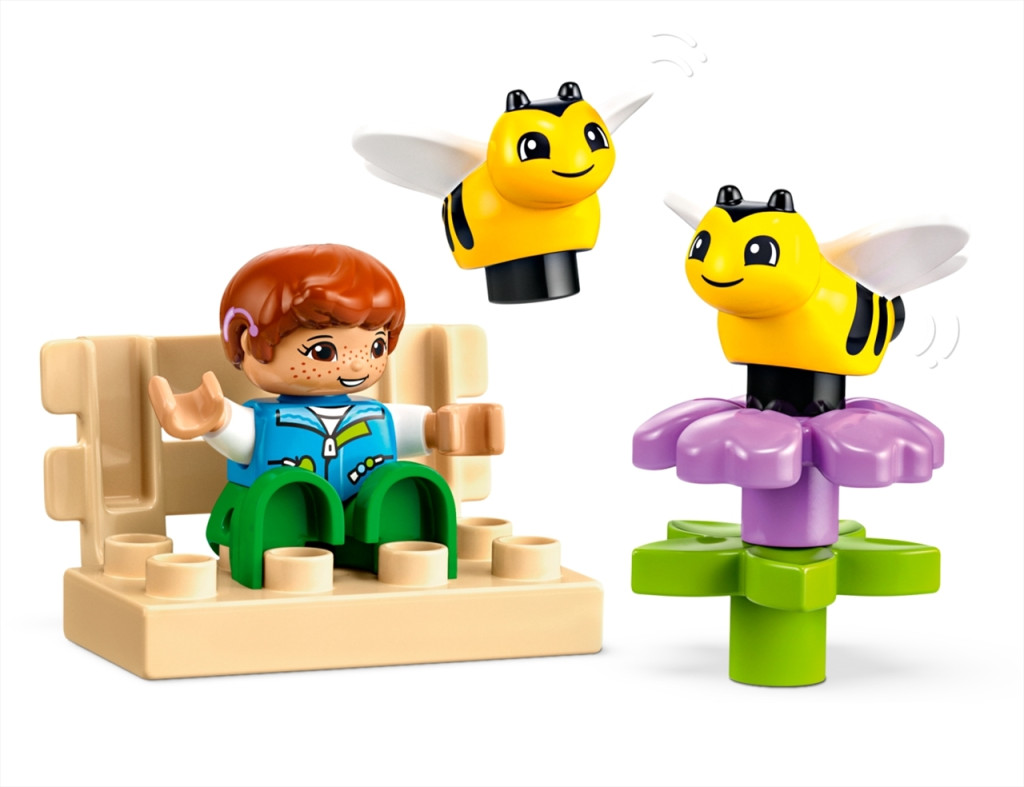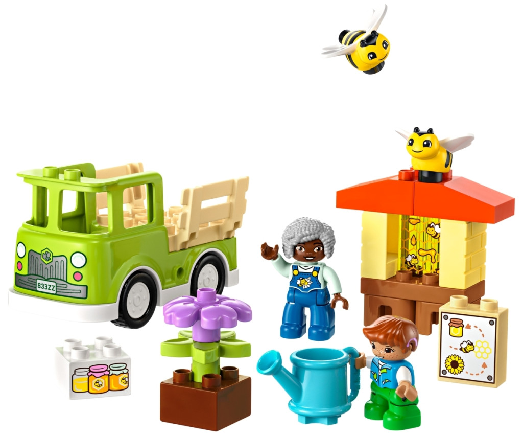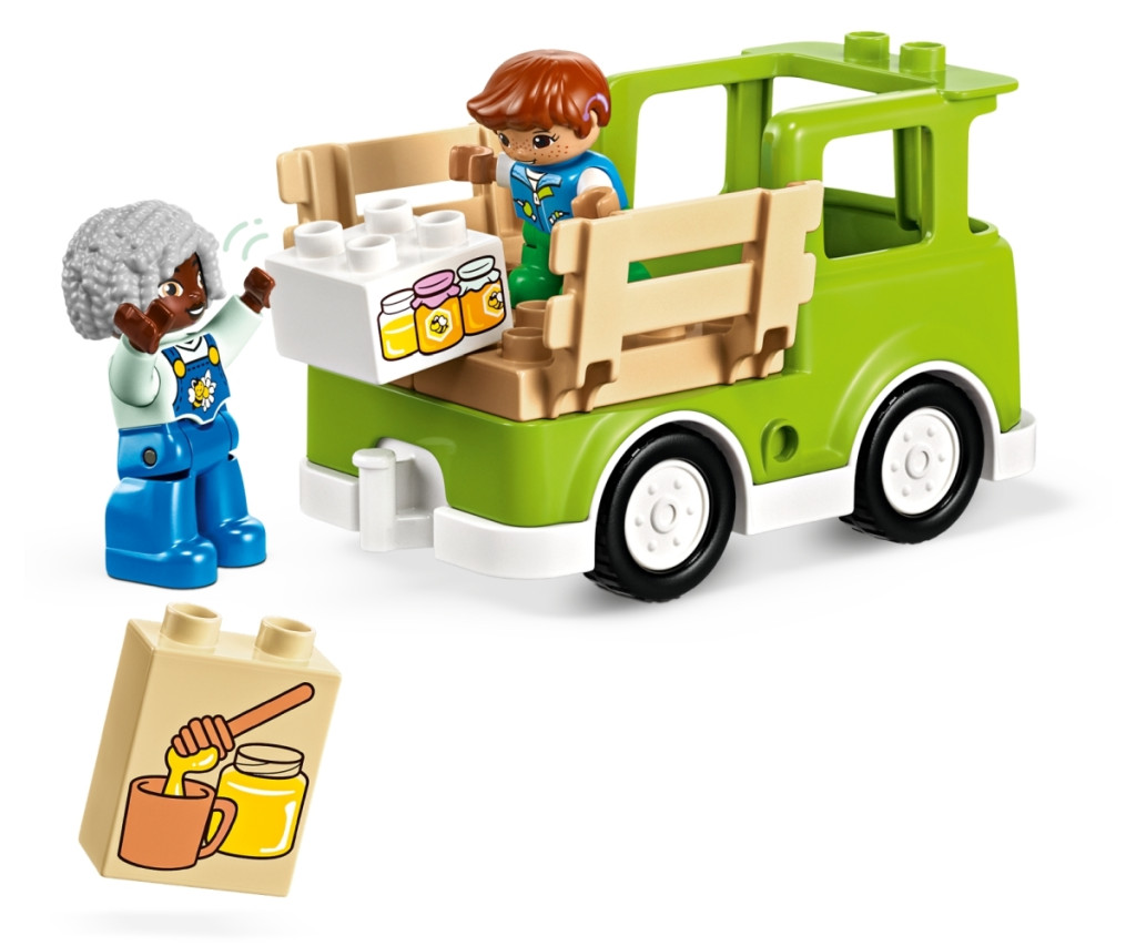 Zsongjanak a kicsik az egyik legfontosabb rovar élete körül: méhek! A LEGO® DUPLO® Városi kalandok Méhek és kaptárak gondozása egy színes építőkészlet, amely segít a kicsiknek megtanulni, hogyan élnek és készítik a mézet ezek a nélkülözhetetlen beporzók. A gyermekek öntözik a növényeket, hogy segítsék a növekedésüket. A méhek elviszik a nektárt a kaptárba, hogy lépesmézet készítsenek. A nagymama- és kisfiú-figurák pedig begyűjtik a mézet, és kiviszik az üvegeket a piacra a vezethető autóval.