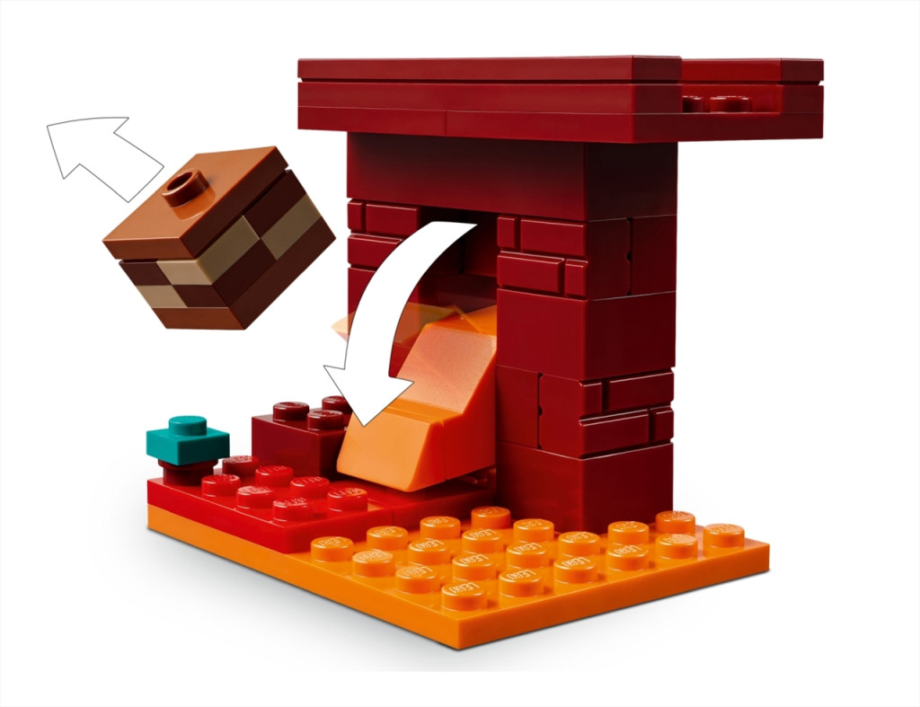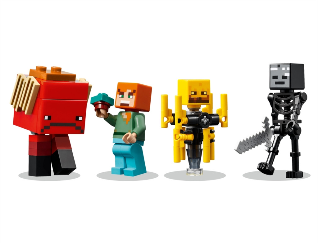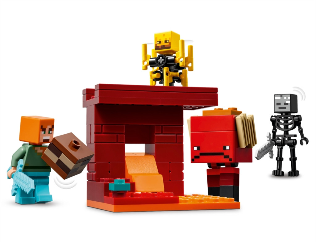 A gyerekek csatlakozhatnak a Minecraft akcióhőséhez, Alexhez, és küldetésre indulhatnak vele, hogy eltávolítsák az ősi törmelékeket a Karmazsin erdőben lévő Alvilági erőd hídjáról. Amikor eltávolították a törmeléket, a lávaelem automatikusan megindul lefelé, és Minecraft figurák (egy kőkardot forgató csontváz és rudat forgató őrláng) próbálják megakadályozni, hogy Alex elmeneküljön. A gyerekek egy ikonikus gyémántkarddal küzdhetnek a mobok ellen, mielőtt egy Minecraft figura, a strider hátára ülnek, akinek beállítható lába és nyerge van. A Minecraft játékosok tudják, hogy szerezniük kell pár torz gombát, hogy irányítani tudják a stridert. Az extra digitális élmény érdekében a gyerekek 3D-ben felnagyíthatják és elforgathatják a modelleket a LEGO Builder appban.