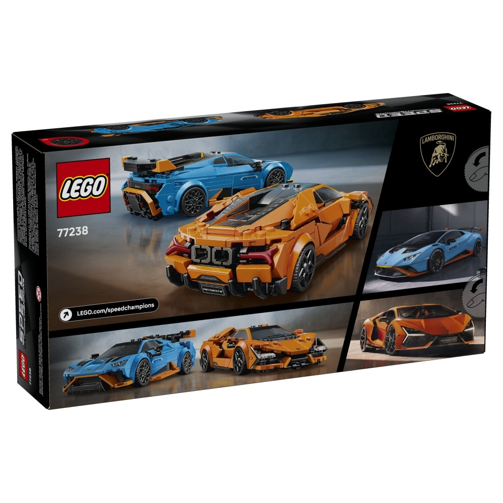 Elképesztő versenyek várnak a LEGO® Speed Champions Lamborghini sportautók dupla csomagjával! A tiéd lehet a narancssárga Lamborghini Revuelto és a kék Lamborghini Huracán STO. Megépítheted és kiállíthatod őket, de játszhatsz is velük. A járművek az ikonikus Sant'Agata Bologneséből valók, és az eredeti autók rengeteg részletét örökítik meg valósághűen. A pilóta minifigurákkal pedig versenyezhetsz.
