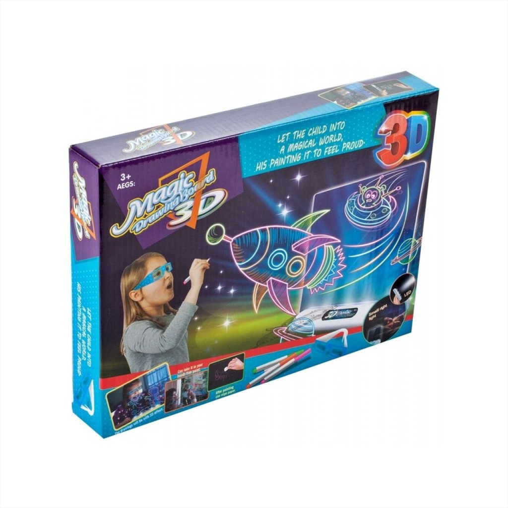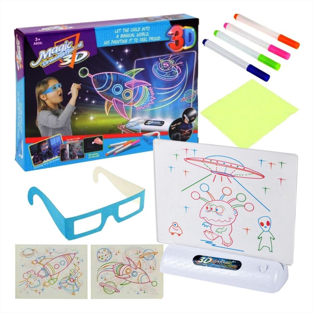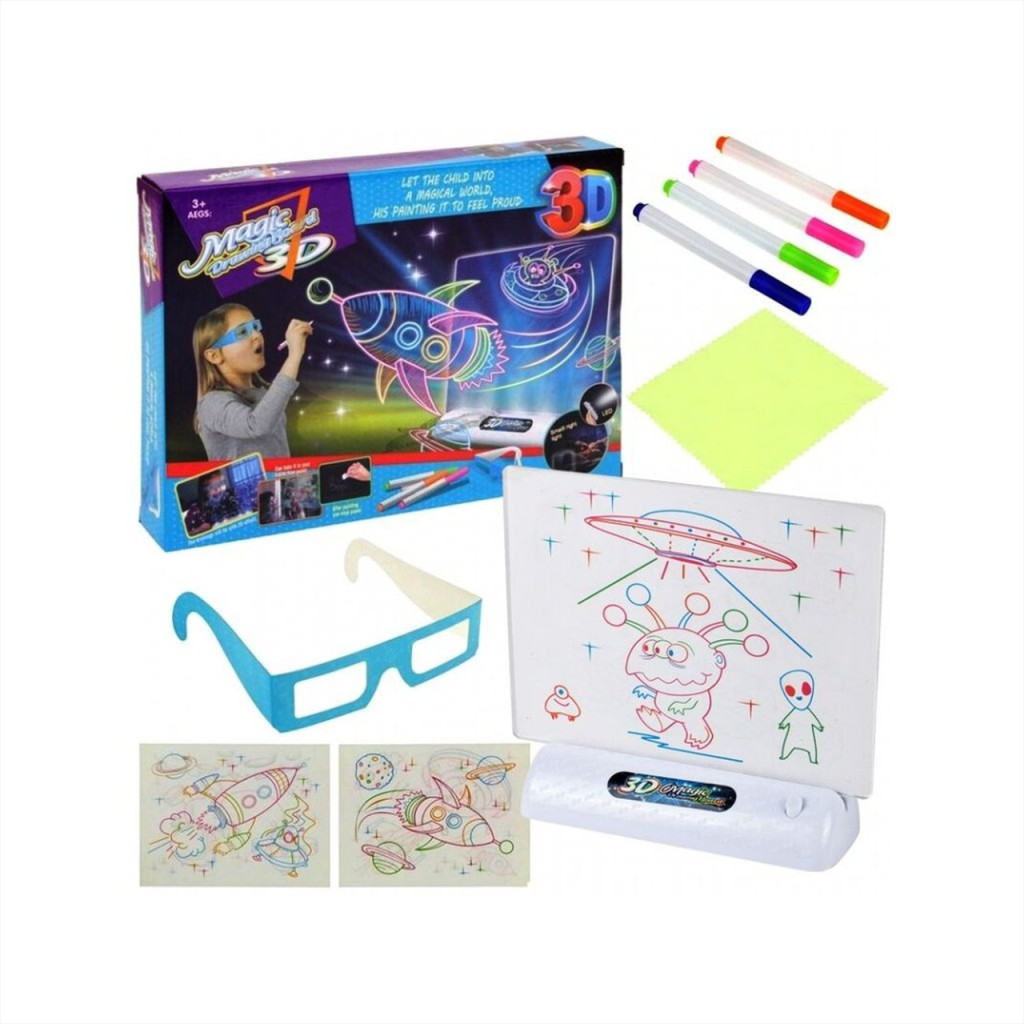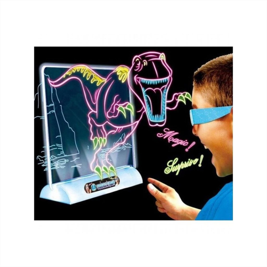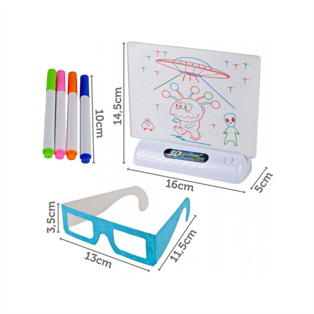 A rajz elkészítése után helyezd az átlátszó táblát egy megvilágított állványba, tedd fel a készletben található szemüveget, és figyeld, hogyan jelenik meg a szemed előtt az igazi varázslat.