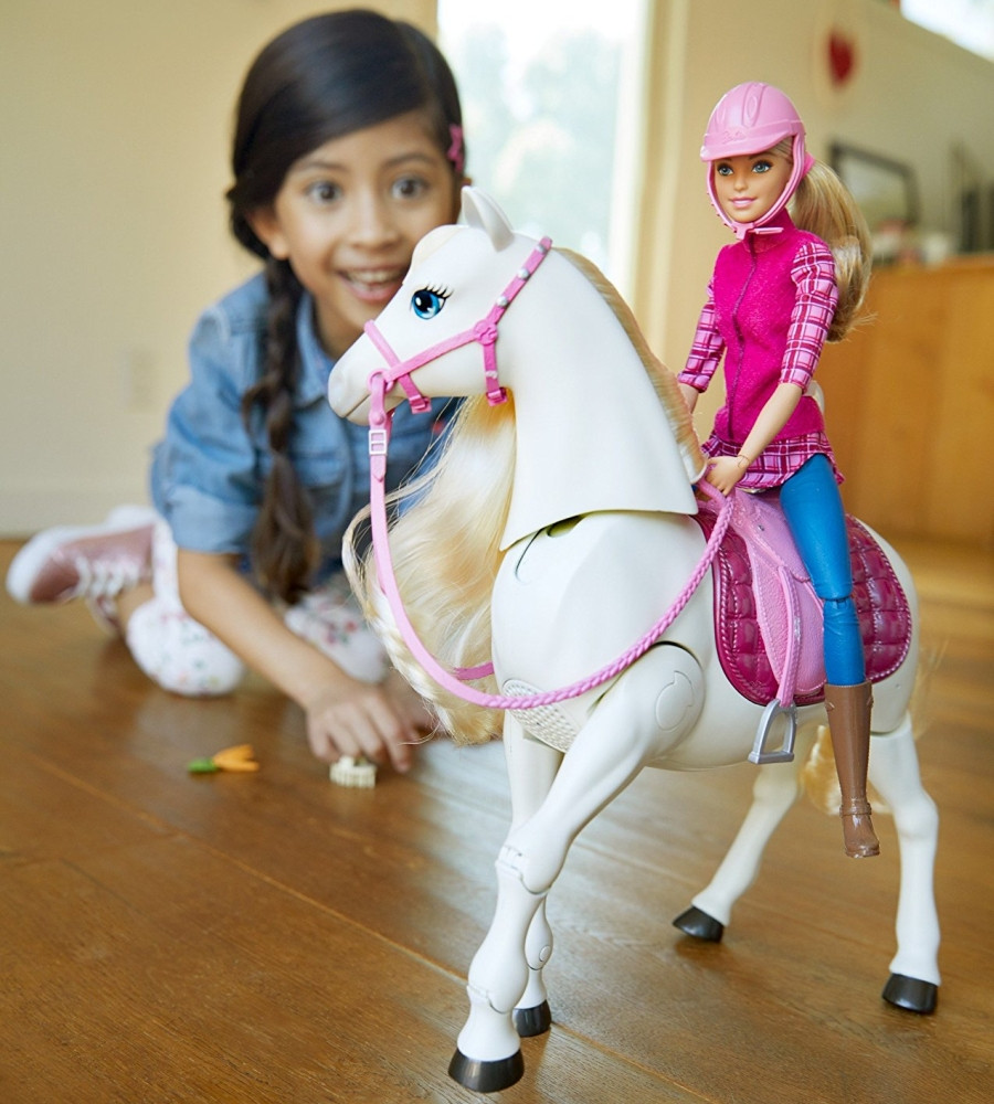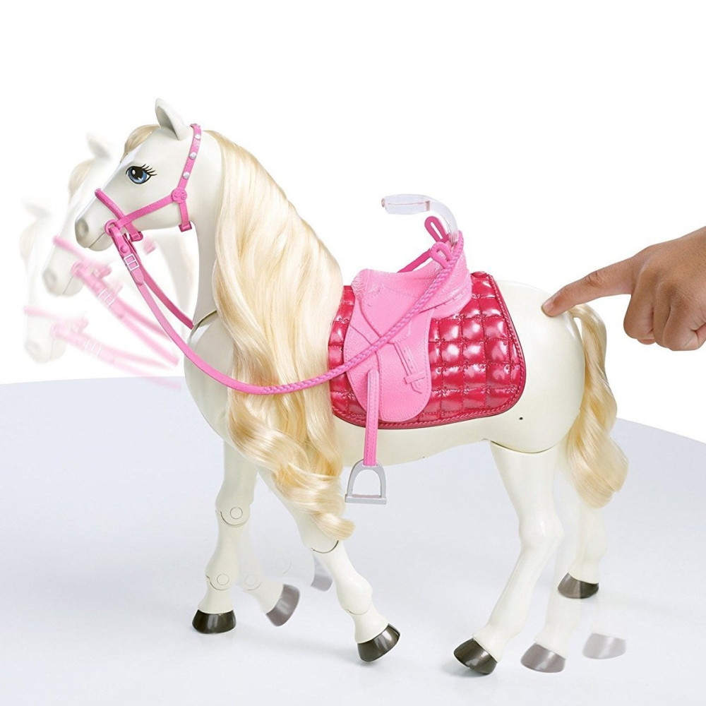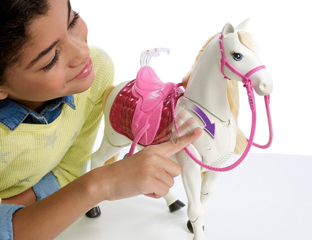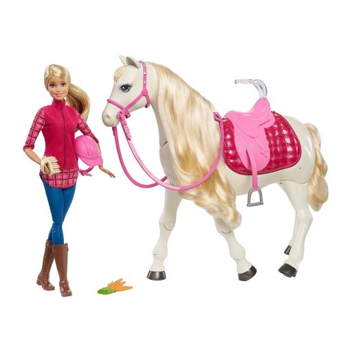 Úgy keltheted életre a lovaglás örömét, miközben Barbie-val játszol, mint még soha, az eddigi leginteraktívabb lovacskája segítségével. A Barbie Dream Horse Intelligens lovacska reagál az érintésre és a hangokra. Nem csak varázslatosan szép, de még okos is: harmincnál is több valósághű reakcióra képes! Ez a csodás állat tud előre sétálni, teljes kört fordulni, és játék közben nyeríteni. Etesd répával, kérdezz tőle bátran, hiszen bólintással válaszol neked! Három különböző dalt tud lejátszani, sőt, három különböző táncot is bemutat. Barbie-val együtt fésüljétek ki a kefével szuperhosszú, hullámos sörényét és farkát, hogy szép selymes legyen. Természetesen Barbie nyeregbe is pattanhat - a hozzá rögzített derékpánt segítségével -, hogy oda lovagolhasson, ahová csak a lovacska viszi.