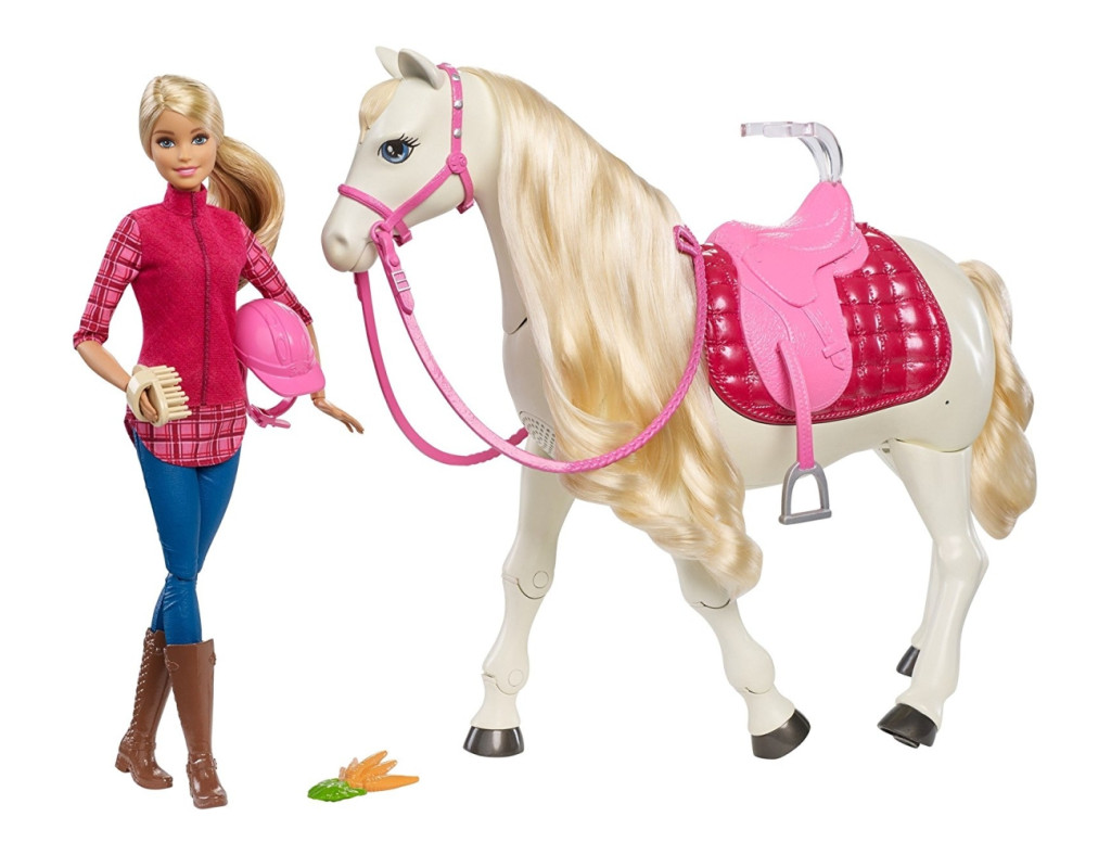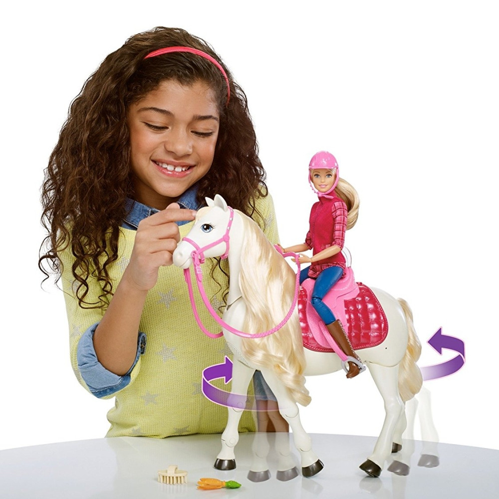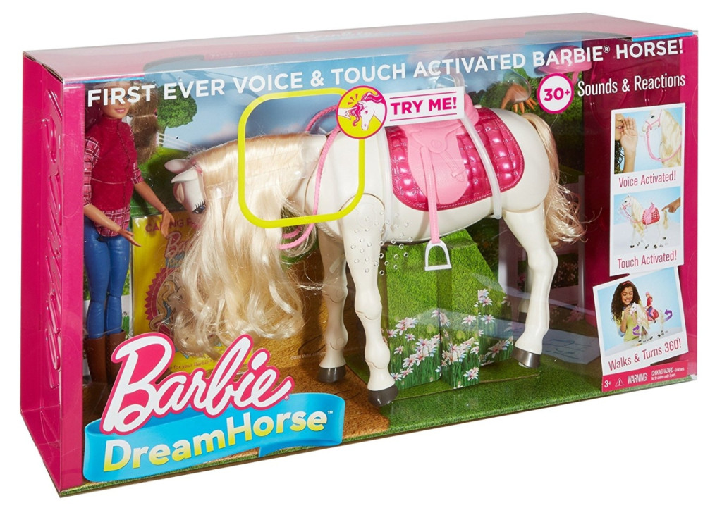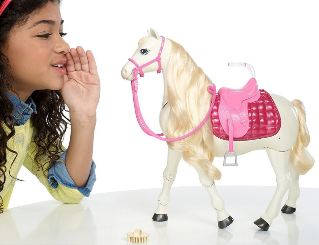 Úgy keltheted életre a lovaglás örömét, miközben Barbie-val játszol, mint még soha, az eddigi leginteraktívabb lovacskája segítségével. A Barbie Dream Horse Intelligens lovacska reagál az érintésre és a hangokra. Nem csak varázslatosan szép, de még okos is: harmincnál is több valósághű reakcióra képes! Ez a csodás állat tud előre sétálni, teljes kört fordulni, és játék közben nyeríteni. Etesd répával, kérdezz tőle bátran, hiszen bólintással válaszol neked! Három különböző dalt tud lejátszani, sőt, három különböző táncot is bemutat. Barbie-val együtt fésüljétek ki a kefével szuperhosszú, hullámos sörényét és farkát, hogy szép selymes legyen. Természetesen Barbie nyeregbe is pattanhat - a hozzá rögzített derékpánt segítségével -, hogy oda lovagolhasson, ahová csak a lovacska viszi.