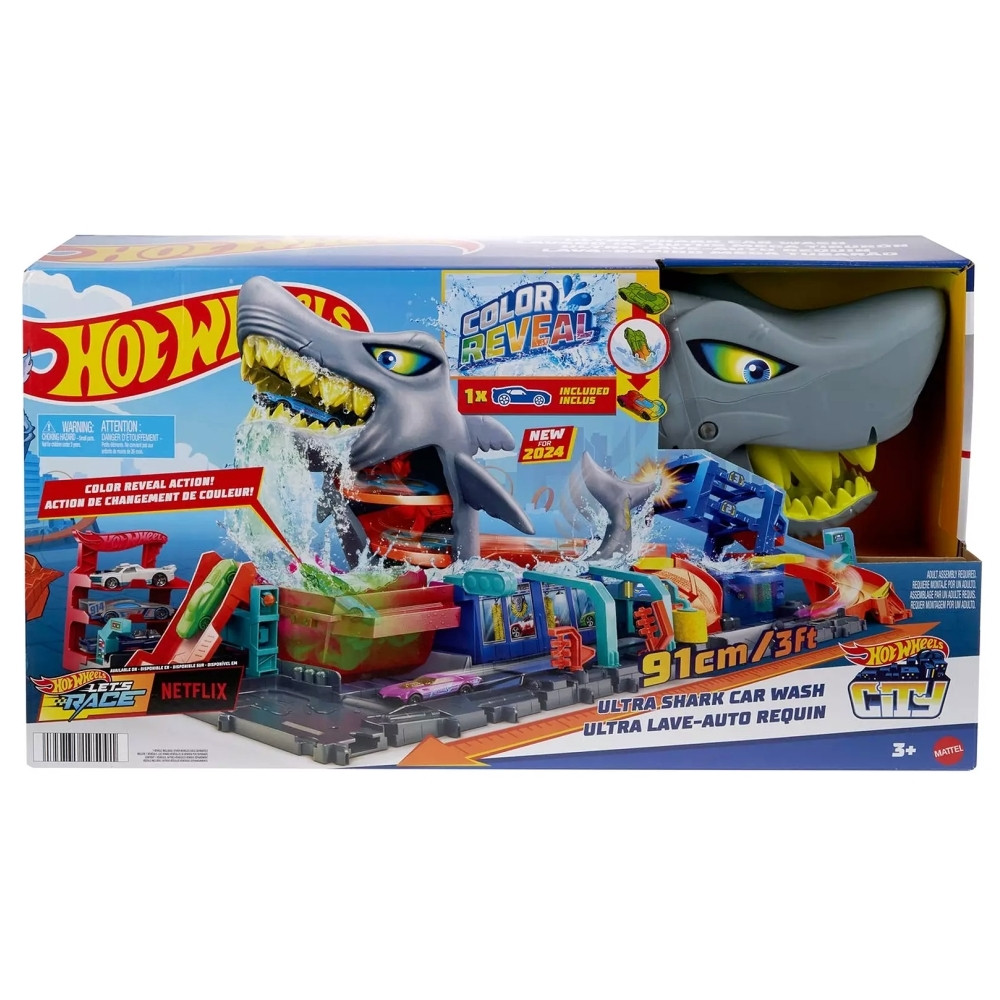 Az autómosás mindig jó móka, főleg a Hot Wheels világában, ahol egy cápás autómosó még bulisabb élménnyé teheti. A készlet telis-tele van meglepetésekkel. Már a csomagban mellékelt kisautó is az. A Color Reveal járgányt ugyanis egyszínű fedőréteg borítja - aminek felfedése igazi kaland. Ha a gyerekek felszáguldanak a rámpán a cápa szájába az autóval és megnyomják a cápa fejét, a festék leolvad és előkerül a valódi fényezés. Ahogy a járgány végigmegy a mosó egyes részein megszabadul a felesleges víztől, így láthatóvá válnak a kidolgozott részletek. A cápa farkát megnyomva a járgányok elindíthatók a parkolóba vagy a jéghideg vízzel megtöltött tartályba, aminek hatására az autó festése megváltozik. Az átváltozás meleg és hideg vízzel bármikor megismételhető - és nehezen megunható. Ha pedig vége a mosós játéknak a készlet félbehajtva egyszerűen tárolható. A készlet egy Color Reveal kisautót is tartalmaz.