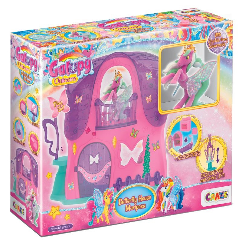 - Tartalom: 1 pillangóház lifttel, 1 Galupy unikornis figura, berendezési tárgyak, matricák