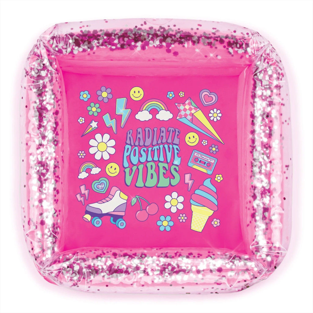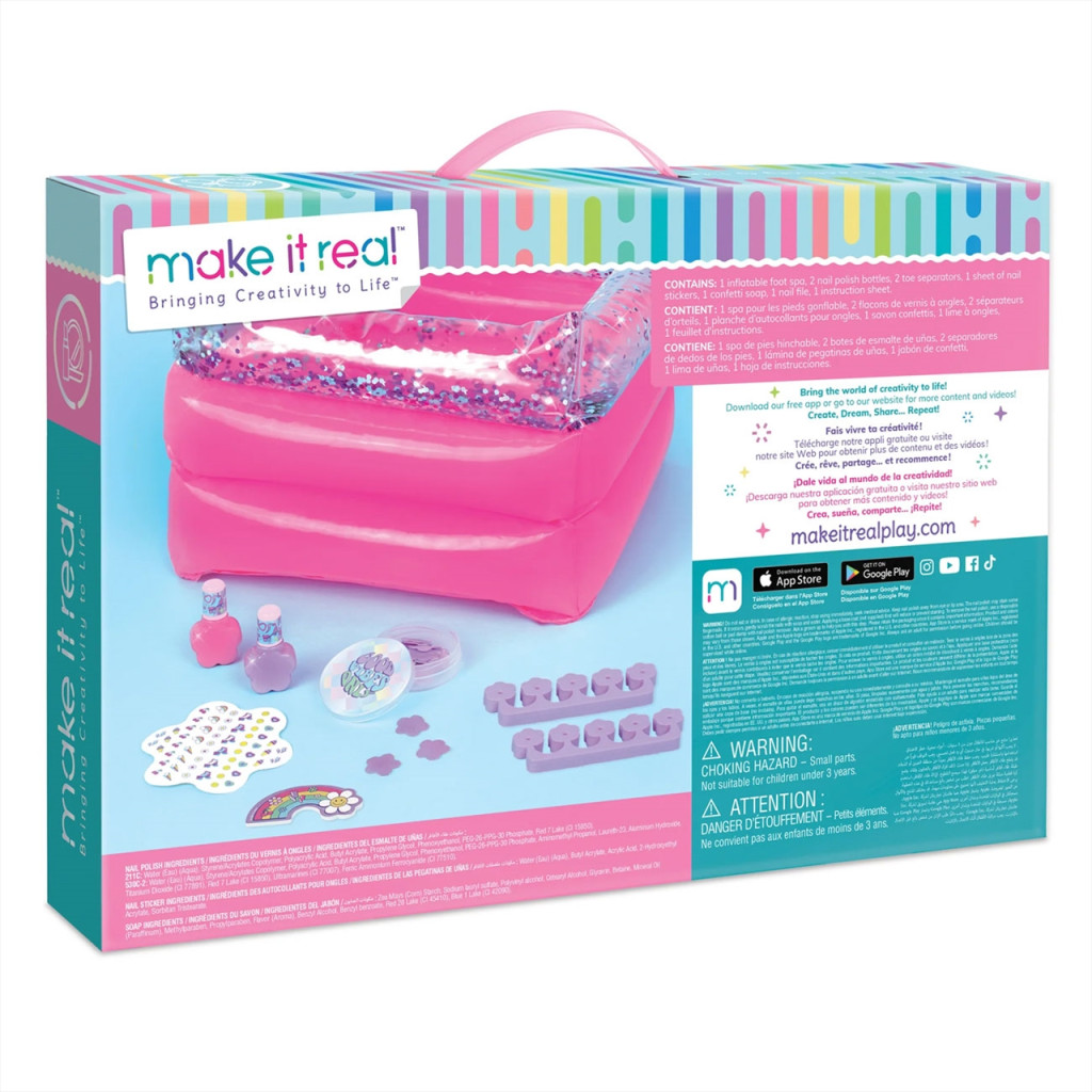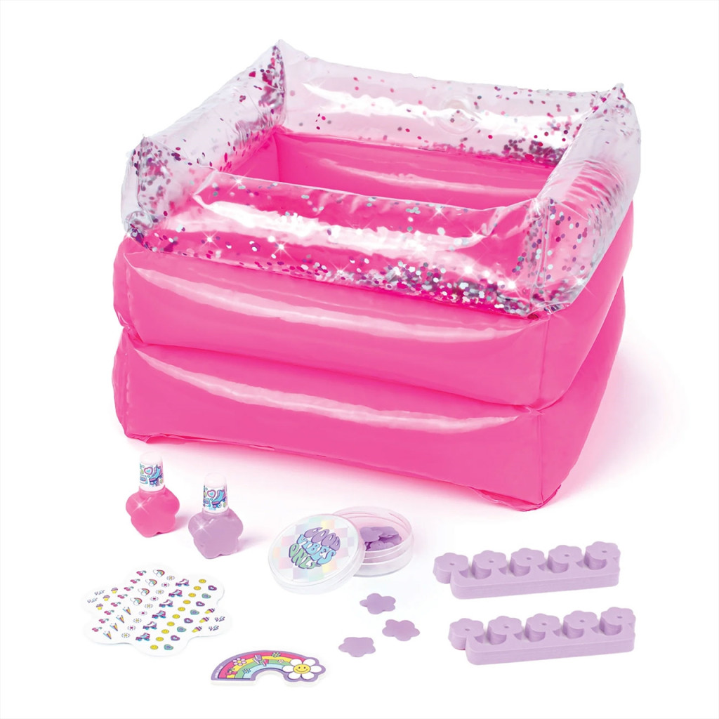 A lábfürdőt nagyon könnyen fel lehet fújni és már mehet is bele a meleg víz, valamint a konfettis szappan, a pedikűr elkészítésében segítségre lesz a készletben található körömreszelő, valamint a lakkok és matricák amik teljessé teszik a csillogó körmöket. A körömlakk vízbázisú és tesztelt, 8 éves kor felett használható.