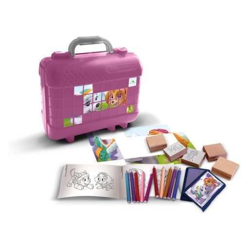 A nyomdákon és tintapárnán kívül színes ceruzákat és színezőket is találsz a bőröndben.